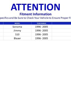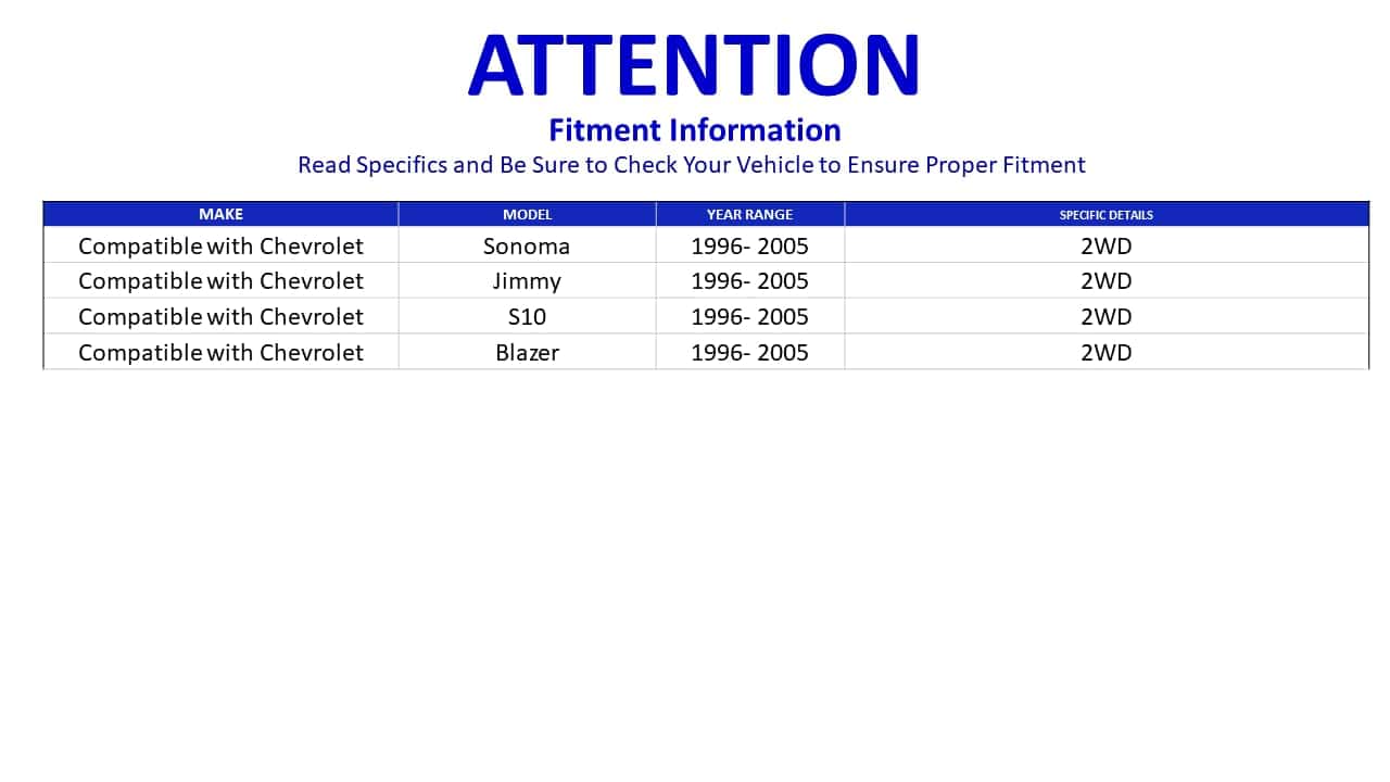 Las piezas de automóvil son vitales para cada vehículo. Es esencial que cada automóvil en el mundo lleve piezas de alta calidad; no solo para funcionar, sino también para transportar de manera segura a familias e individuos en sus rutinas diarias y aventuras. Queremos que nuestros clientes olviden cualquier otro problema una vez que instalen nuestras piezas; por eso nuestras piezas de repuesto están diseñadas para coincidir y encajar sin problemas. Nuestro equipo de control de calidad se asegura de que solo se utilicen materiales de alta resistencia en nuestro proceso de fabricación. En PartsW, nos enorgullece ofrecer piezas de automóvil de calidad de marcas premium a un precio justo a nuestros clientes. Almacén en EE. UU.: Entrega más rápida GRATUITA a los 48 estados inferiores (aproximadamente 2-5 días hábiles). El paquete incluye: 2 Manguitos de Ajuste, 2 Extremos de Barra de Acoplamiento Exteriores Delanteros, 2 Extremos de Barra de Acoplamiento Internos Delanteros. Este kit es compatible con: Chevrolet Blazer 1996-2005 Modelos 2WD, Chevrolet S-10 1996-2003 Modelos 2WD, GMC Jimmy 1996-2001 Modelos 2WD, GMC Sonoma 1996-2003 Modelos 2WD, Isuzu Hombre 1996-2000 Modelos 2WD. Nota importante: -Antes de realizar el pedido, verifique el modelo de su automóvil . Lea atentamente las notas, si tiene alguna pregunta, contáctenos. La información de ajuste proporcionada es solo de referencia.