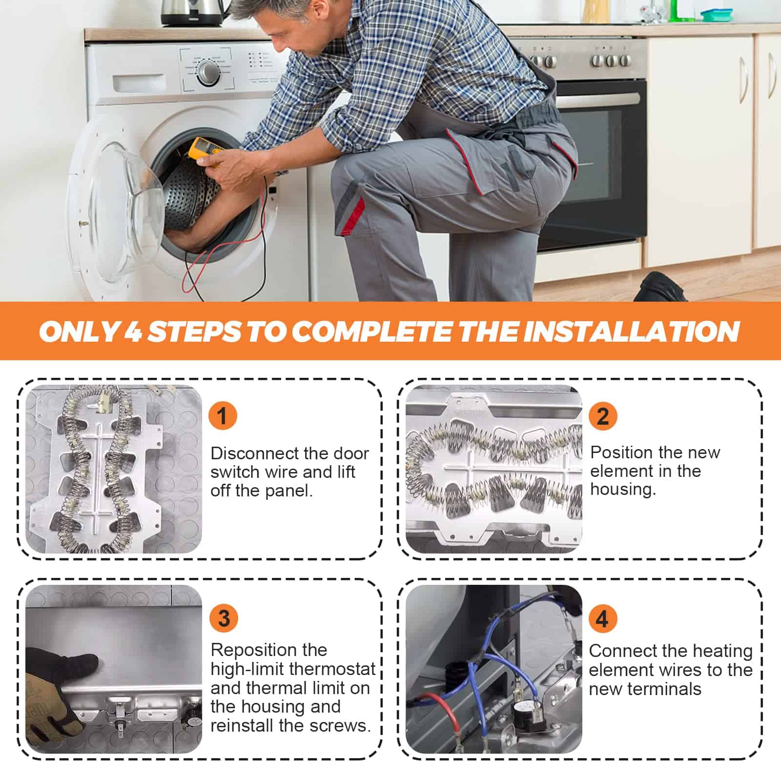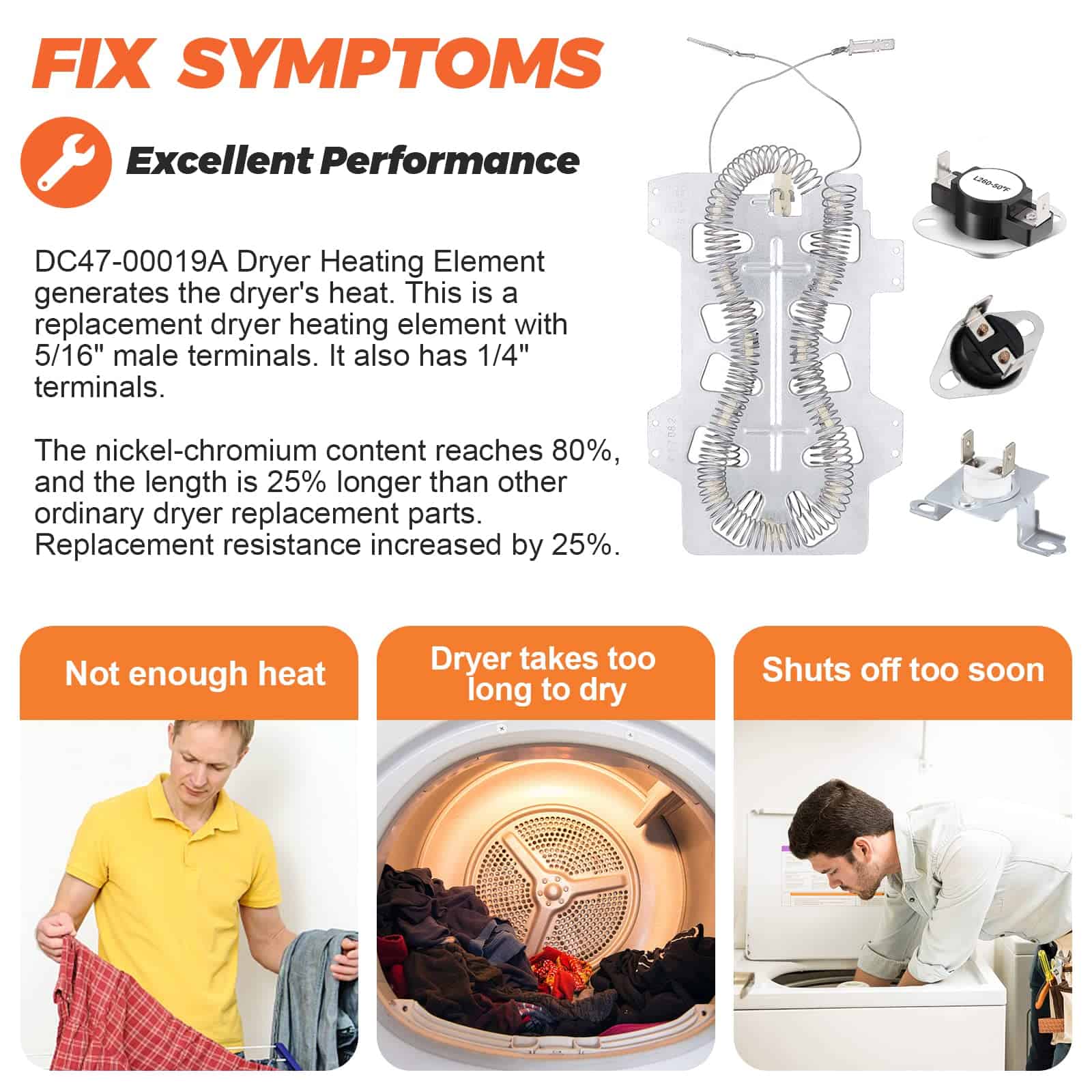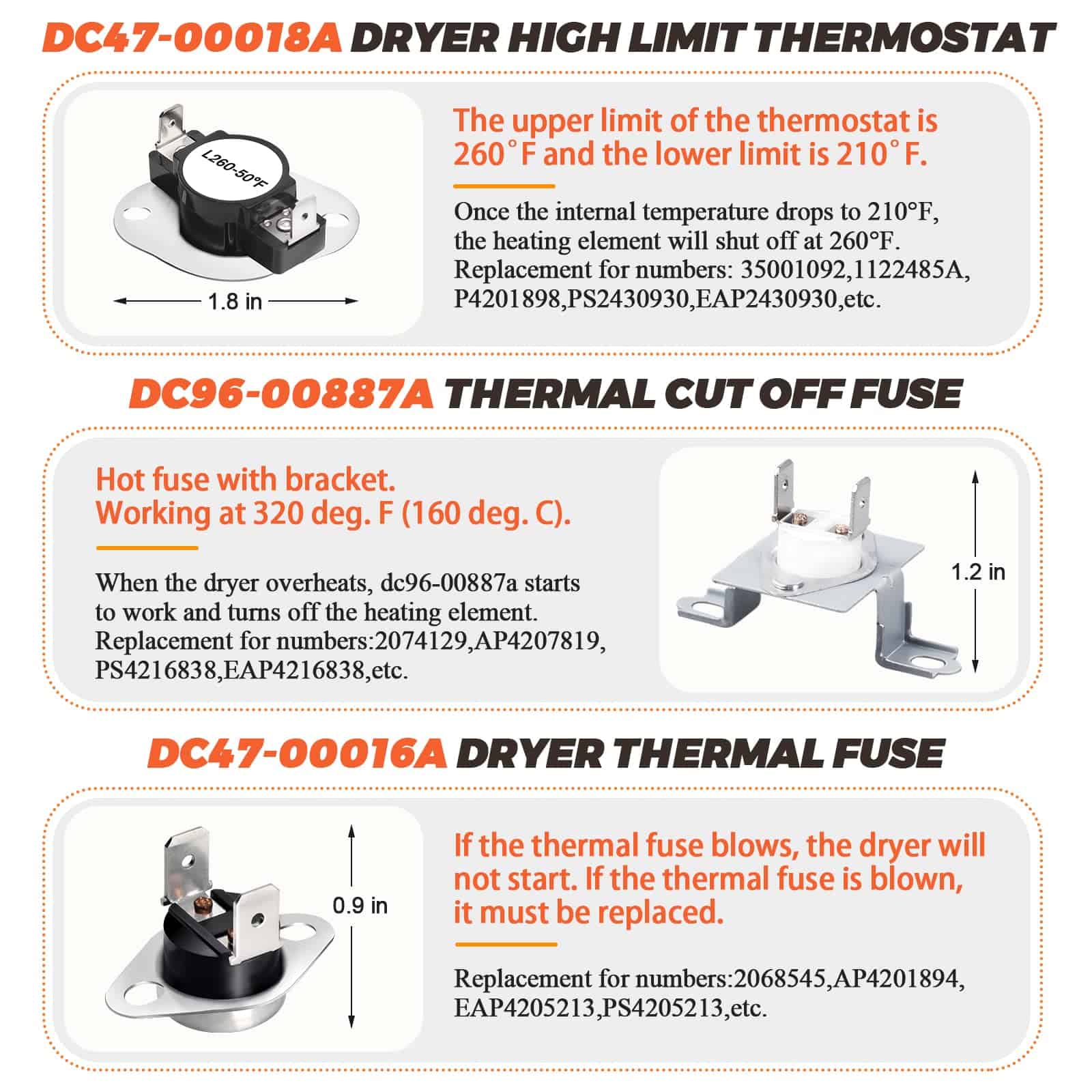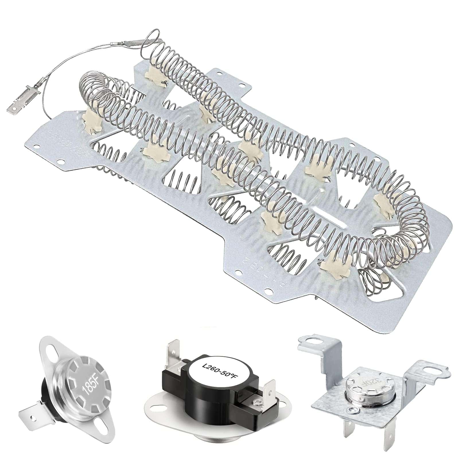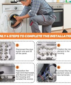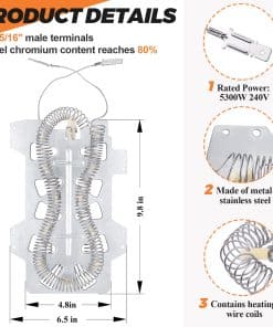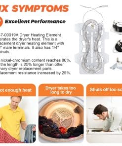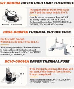 DESCRIPCIÓN DEL PRODUCTO: Las piezas de repuesto están hechas de material de alta calidad. El elemento calefactor de secadora Samsung DC47-00019A está hecho de material de calidad (metal o acero inoxidable). El contenido de níquel-cromo del elemento calefactor de la secadora alcanza el 80%, y la longitud del cable de calefacción eléctrica (actualizado) es mayor que la de otras piezas de repuesto de secadora comunes. La resistencia de reemplazo aumentó en un 25%. DC96-00887A: Fusible térmico de límite alto de secadora (termostato) con soporte. DC47-00016A: Fusible térmico de secadora (termostato), ubicado en la carcasa del ventilador. DC47-00018A: Termostato de límite alto de secadora. L260-50F. materiales (metal o acero inoxidable), el producto tiene una larga vida resistente al calor y es fácil de instalar. PAQUETE INCLUYE: 1 PC Elemento Calefactor de Secadora DC47-00019A 1 PC Fusible Térmico DC96-00887A 1 PC Fusible Térmico DC47-00016A 1 PC Termostato de Límite Alto DC47-00018A CONSEJOS DE INSTALACIÓN: Desconecte su secadora de su fuente de alimentación antes de comenzar la reparación. REPARA LOS SIGUIENTES SÍNTOMAS: Tarda mucho en secar Demasiado caliente Sin calor o no suficiente calor FUNCIONA CON LA MAYORÍA DE LAS MARCAS: Samsung Kenmore FUNCIONA CON LOS SIGUIENTES NÚMEROS DE MODELO: Samsung: DV419AEUXAA0001 DV419AEWXAA0002 DV220AEWXAA DV410AERXAA DV410AER/XAA DV5471AEP/XAA-01 DC220AEW/XAA-01 DV363EWBEUF/A1-00 y más. Kenmore: 40289032011 TENGA EN CUENTA: El nombre de la marca o la designación del modelo de este producto se hace únicamente con fines de demostrar la compatibilidad. ¡Gracias!