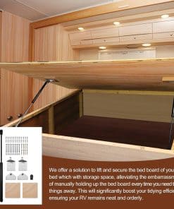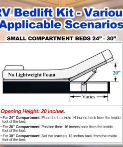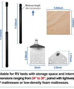 Kit de Elevación de Cama para RV de WEST ORGIN, solo compatible con RV y vehículos recreativos con cajas de almacenamiento, el tamaño interno es de 24″-30″. Incluye hardware de instalación, bloques de madera y 2 resortes de gas de 17″ por 80 lb (432 mm x 352N). No es aplicable a literas en camas deslizantes con plataformas base fijas, aplicaciones de carga lateral o camas de RV. Por favor, confirme si su modelo es adecuado antes de comprar.