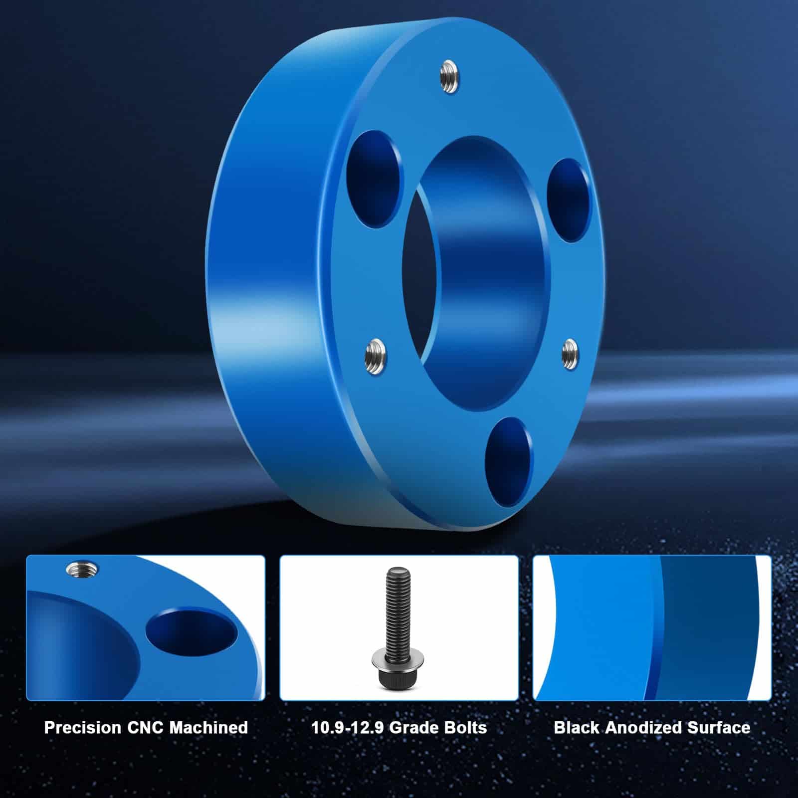 El kit de elevación de nivelación ECCPP de 2.5 pulgadas en azul está diseñado para elevar su vehículo Ford F-150 2WD 4WD 2004-2021 en la parte delantera, proporcionando un aumento de 2.5 pulgadas en la altura. Fabricado con aluminio billet de grado aeronáutico 6061-T6, este kit de elevación es durable y resistente a la corrosión. Los pernos de grado 10.9 preinstalados están tratados térmicamente y endurecidos para una mayor durabilidad. Este kit de nivelación mejora el rendimiento de su vehículo y aumenta la distancia al suelo, lo que le permite instalar llantas y neumáticos personalizados más grandes. Obtenga este par de kits de elevación de nivelación de 2.5 pulgadas para disfrutar de un servicio postventa satisfactorio y la posibilidad de resolver cualquier problema con la ayuda de nuestro equipo de atención al cliente.