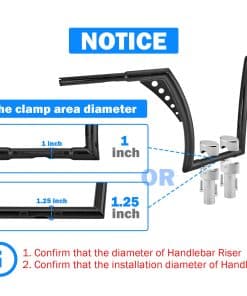La abrazadera del manillar se puede instalar con los pernos OEM. Tamaño del perno: 0.49″ X 14 X 2.9″.