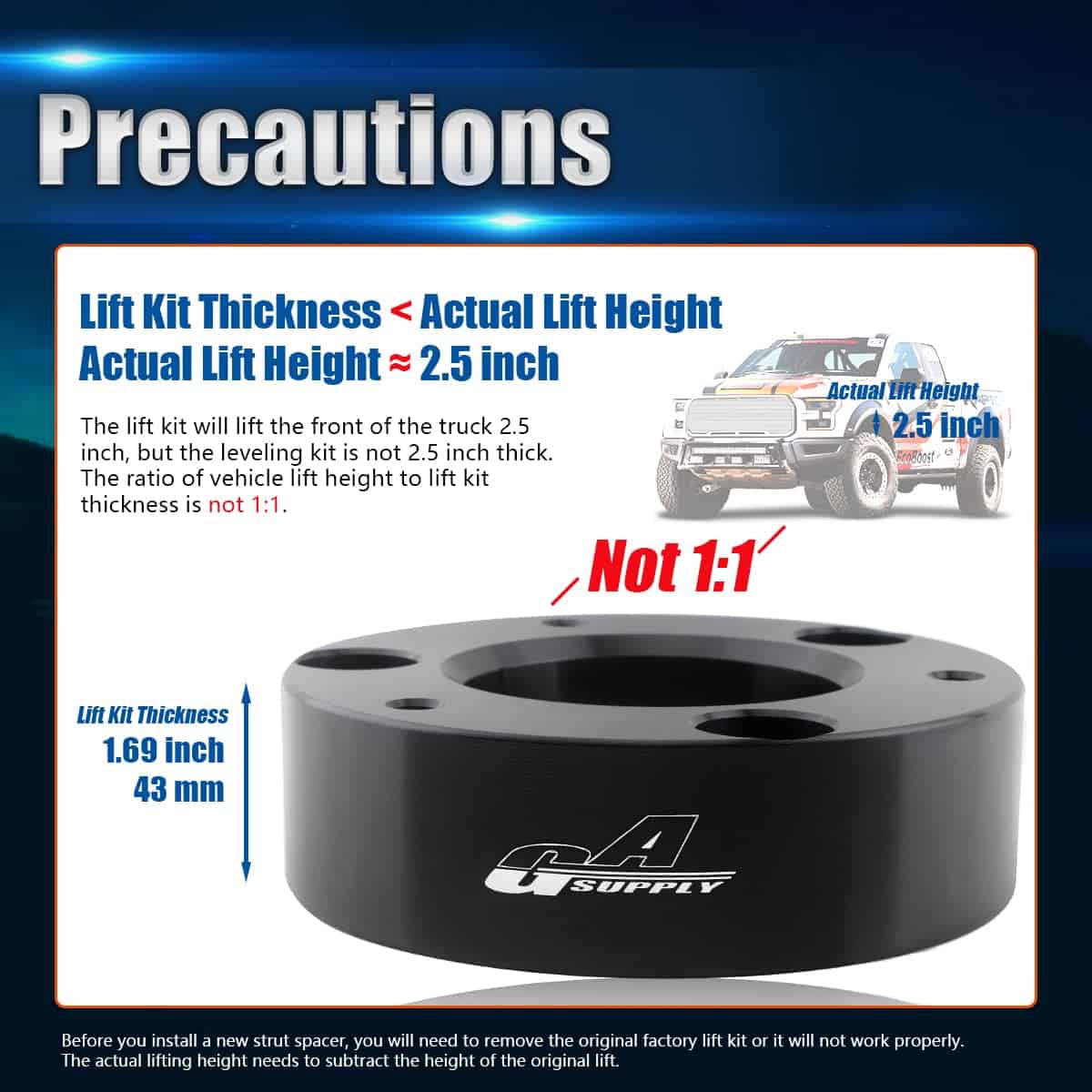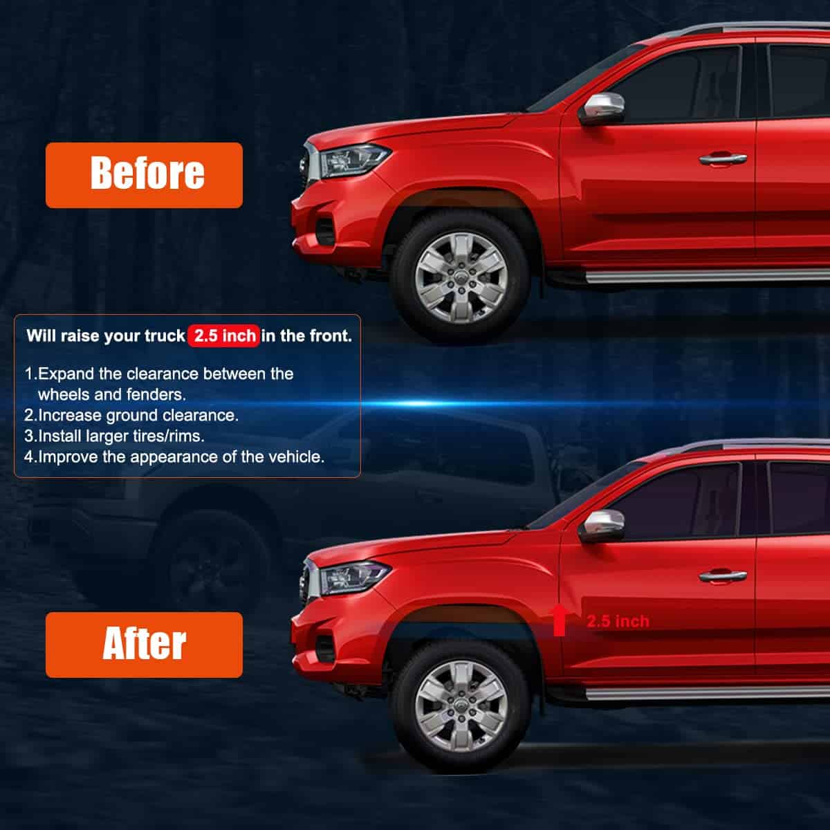 Paquete Incluido – 2 Kit de Elevación Frontal forjado de 2.5 pulgadas (63.5 mm) Compatible con 2007-2020 Chevy Silverado 1500 2007-2020 Chevy Suburban 1500 2007-2020 Chevy Tahoe 2WD 4WD GMC Sierra 1500 2WD 4WDBeneficios – Este espaciador de elevación de amortiguador puede expandir la distancia entre la rueda y el guardafango, y obtener una mayor altura libre para que el vehículo se vea más agresivo. Puedes instalar neumáticos/llantas más grandes y anchosMaterial – Forjado de aluminio 6061 T6, con pernos de 12.9 y tuerca de seguridad única, más resistente y confiable. La superficie tiene un recubrimiento negro único, que brinda una apariencia más destacada, y no es fácil de oxidar y desvanecerNota – Debido a la geometría de la suspensión, la altura y el grosor del kit de nivelación del espaciador de amortiguador no son de 1:1, elevarán la camioneta delantera en 2.5», pero el grosor del kit delantero es menor a 2.5»Instalación – Fijación con pernos, fácil de instalar, no se requiere modificación del vehículo. Se tarda aproximadamente 1-2 horas. Ahorre su tiempo y dineroServicioGarantía de por Vida. Si tienes alguna pregunta, no dudes en contactarnos y te responderemos en 24h
