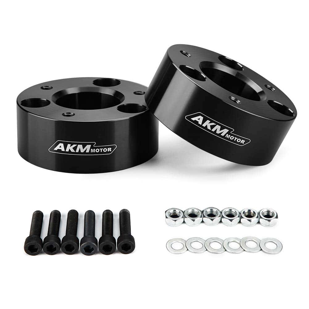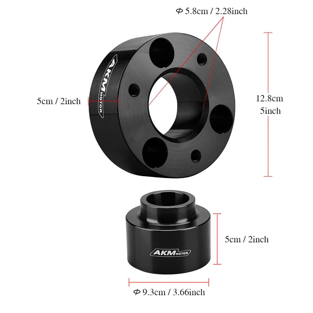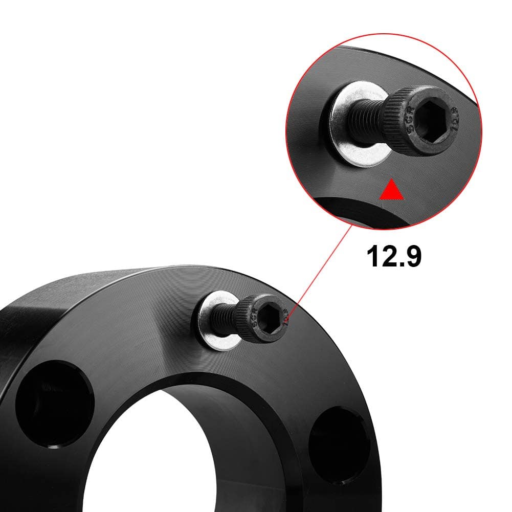 b VENTAJAS: r Espaciadores: Está hecho del mismo material que los aviones, que es fuerte y ligero, y tiene una resistencia a la compresión más fuerte que el acero. La superficie anodizada negra de alta calidad mejora la resistencia a la corrosión, más duradera. r Tuercas y juntas: las tuercas están hechas de tuercas de alta dureza 10.9-12.9, las juntas están hechas de herramientas de maquinado CNC de alta precisión, tienen la capacidad de anti-corrosión, anti-óxido. br br b FUNCION: r Mantiene nivelado el frente y la parte trasera del vehículo. r Aumenta la distancia entre el vehículo y el suelo. r Evita el roce del chasis, permitiéndole instalar neumáticos y llantas más grandes. br br b NOTA: r El grosor del espaciador y la cantidad de elevación no son una relación de 1 a 1: Para elevar la parte delantera 2″ el espaciador será de 1.33″ de grosor. Para elevar la parte delantera 3″ el espaciador será de 2″ de grosor. Para elevar la parte trasera 2″ el espaciador será de 3″ de grosor.