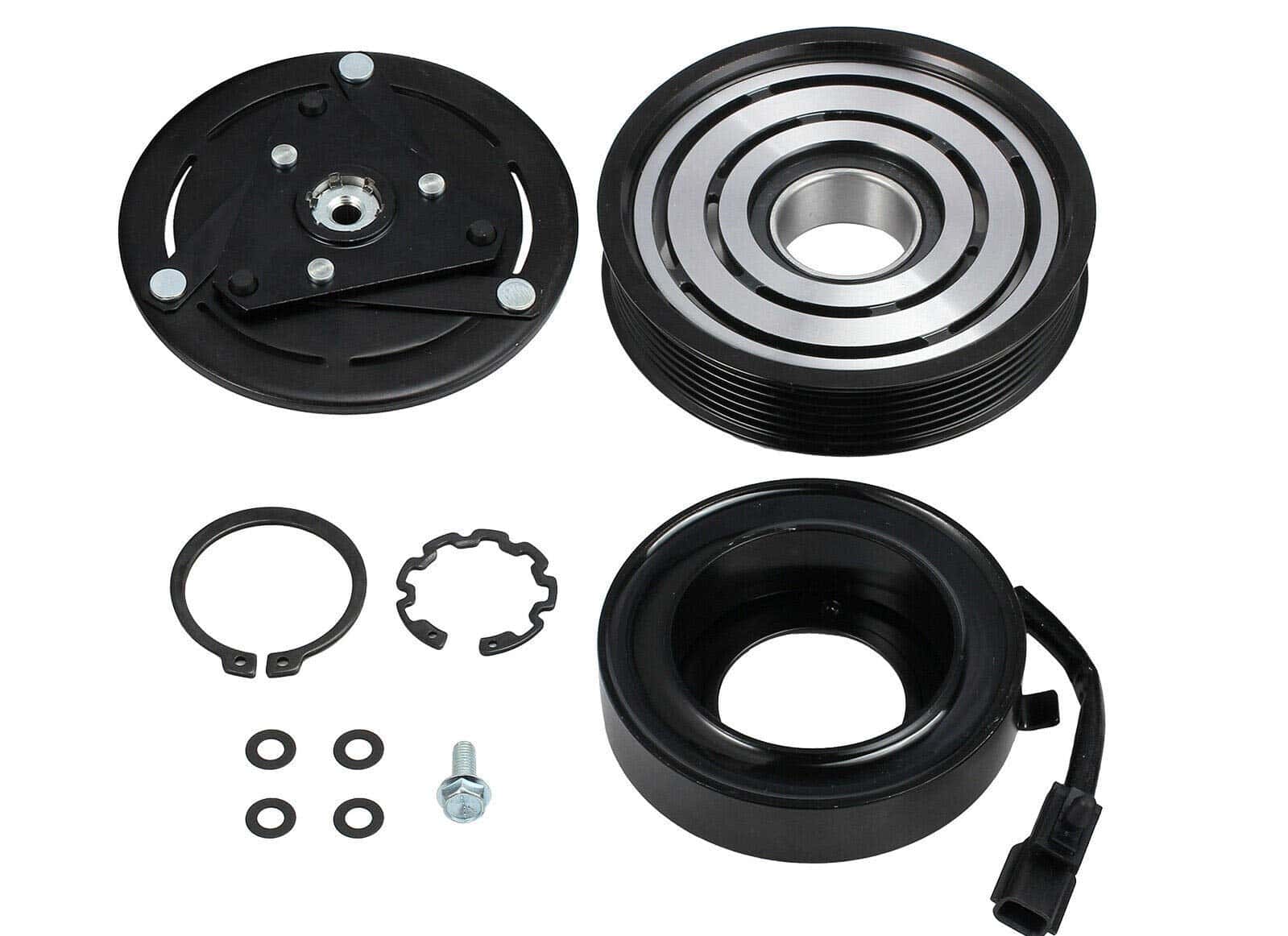 Kit de Embrague del Compresor de Aire Acondicionado, que incluye polea, rodamiento, bobina y placa, compatible con Nissan Altima 2.5L de los años 2007-2012. Esta polea de 6 ranuras de 5 pulgadas es compatible con el modelo original DSC171C. No se ajustará a compresores de post-venta. Incluye polea con rodamiento prensado, bobina electromagnética, cubo de placa delantero, shims, clips de retención y perno central. Disfruta de un funcionamiento óptimo y confiable con este kit de embrague de compresor de aire acondicionado.