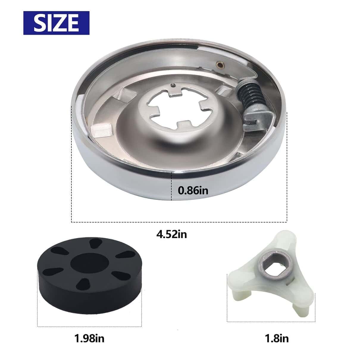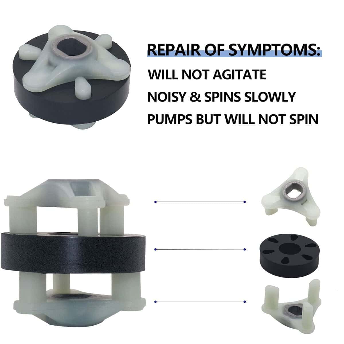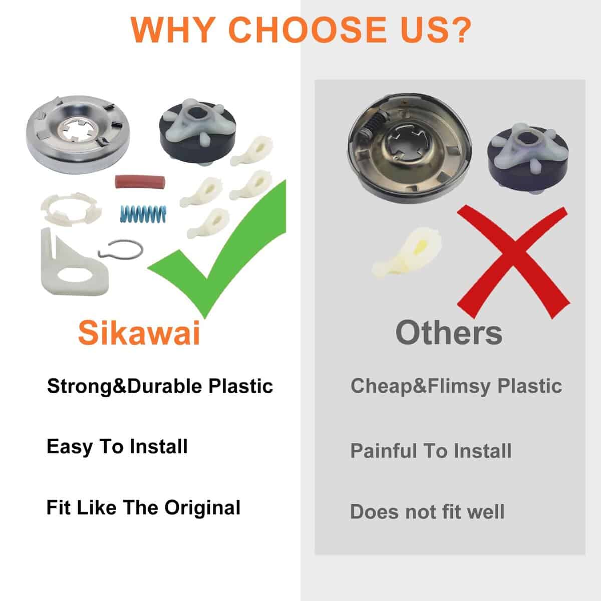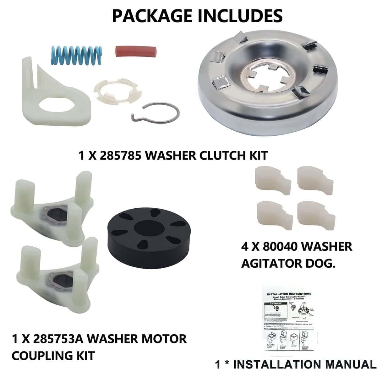 Kit de Embrague para Lavadora 285785 hecho de plástico y metal duraderos, evita grietas durante la instalación y el uso, y garantiza una larga vida útil en lavadoras de accionamiento directo (sin correa). ¿Cuándo debo reemplazarlo? La lavadora no giraría; gira lentamente, no gira correctamente, la lavadora no agitaría ni giraría, la lavadora chirriaba y golpeaba mientras giraba, y otros problemas similares. Instalar Kit de Embrague para Lavadora 285785 y Kit de Acoplamiento de Motor 285753A y 4 piezas 80040 para Perros Agitadores de Lavadora es fácil! Herramientas: Sockets, trinquete. Desconecte el cable de alimentación y la manguera de agua/drenaje. Quite el agitador. Coloque la lavadora contra la pared. Desenchufe el arnés de la transmisión, retire la transmisión y reemplace el embrague. El ensamblaje es lo opuesto al desmontaje. También puedes ver videos de reparación en YouTube para el reemplazo. Sikawai se esfuerza por mantener la equidad y la honestidad con todos los clientes, y haremos de su satisfacción nuestra principal prioridad, Si tiene algún problema, por favor díganos
