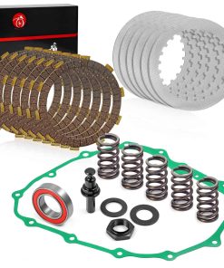 Incluye pasador elevador de embrague, rodamiento, tuerca de bloqueo, arandelas de o-ring, placas de fricción de embrague, placas separadoras, resortes pesados y junta de tapa. Números de parte OEM: 22847-HN1-010, 91008-KCY-671, 22201-MAL-600, 22321-MV4-000. Compatible con modelos Honda Sportrax 400 TRX400EX 2×4 del 1999 al 2008 y TRX400X 2×4 del 2009 al 2014.