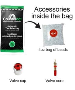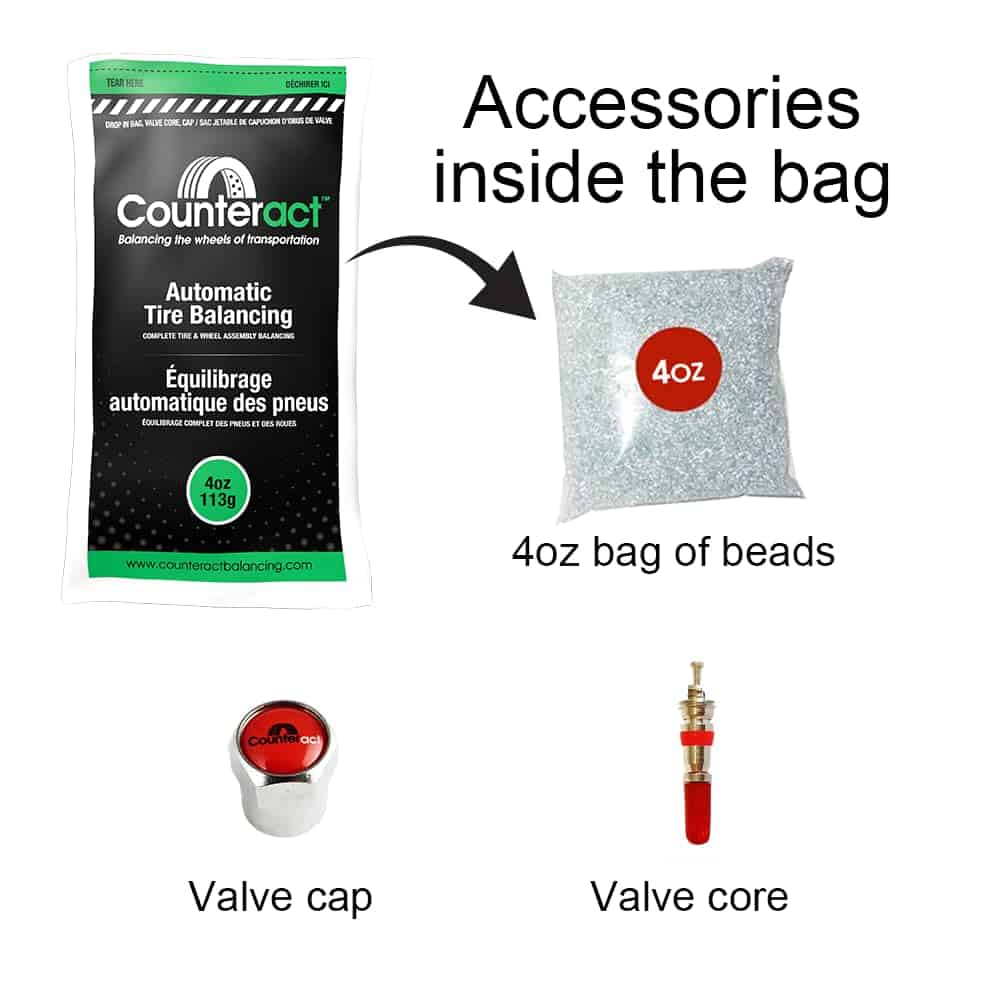 Counteract u cualquier otro producto de equilibrio interno de neumáticos NO se recomienda para vehículos pequeños de pasajeros (como un Honda Civic, Pequeños Crossovers, SUV, etc.). Este producto solo se recomienda en vehículos con suspensión de 1/2 tonelada en adelante, Vehículos Todo Terreno, Motocicletas, ATV, UTV, Vehículos Comerciales, Autobuses, RV y más. Las perlas de equilibrio de Counteract son el único producto de equilibrado de neumáticos y ruedas completas en el mercado que ha demostrado mejorar la economía de combustible en dos pruebas separadas S.A.E y TMC tipo II. Las perlas de equilibrio de Counteract están fabricadas como una perla de vidrio templado que se coloca dentro de un neumático o se inyecta a través de la válvula de la rueda, permitiendo un equilibrio completo del conjunto de ruedas y neumáticos sin usar contrapesos externos. Counteract prolonga la vida útil del neumático, mejora la economía de combustible, equilibra el conjunto completo de ruedas, disminuye la vibración y la fatiga del conductor, dura toda la vida del neumático y es respetuoso con el medio ambiente. Los kits de bricolaje incluyen todo lo que necesitas para instalar el producto en casa a través de la válvula de la rueda. Si estás montando neumáticos nuevos, cada bolsa de Counteract de 4oz en adelante es un sistema de bolsa de inserción. Simplemente abre tu bolsa de perlas de equilibrio Counteract y coloca la bolsa transparente interna que contiene Counteract dentro de la cavidad del neumático mientras se está montando. Una vez que el neumático esté sellado y montado en el vehículo, la bolsa se romperá por sí sola cuando el vehículo comience a moverse.