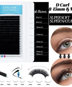 4. Pestañas Falsas y Tiras de Práctica de Pestañas: Hay un total de 16 filas en nuestra bandeja de pestañas falsas, cada pestaña falsa tiene una longitud diferente (0.07D, rizo mixto de 8 a 15 mm), que es naturalmente suave. Pestañas de diferentes longitudes que pueden tomar perfectamente en cuenta la extensión de las pestañas superiores e inferiores. Este kit de extensión incluye 3 cajas de pestañas falsas y 10 pares de tiras de extensiones de pestañas.
