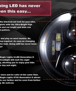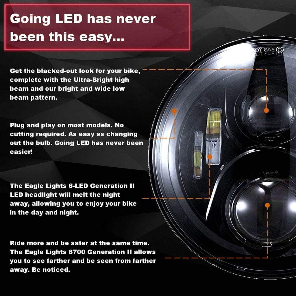 El faro proyector LED Eagle Lights 8700 utiliza LED de color blanco brillante de alta intensidad con una temperatura de color de más de 6000K. Este es un faro LED de alto rendimiento, diseñado para ser un reemplazo directo de faros de 7″. Ofrece una visibilidad, seguridad y durabilidad superiores, convirtiéndolo en el faro LED de 7″ más avanzado disponible. La luz es un reemplazo directo para un H6024, 2D1, o cualquier otro faro redondo de 7″.