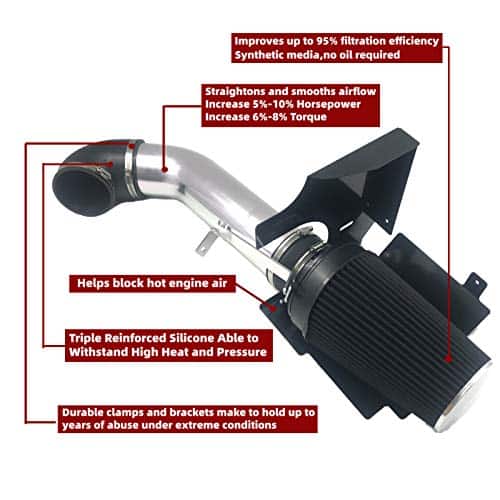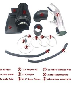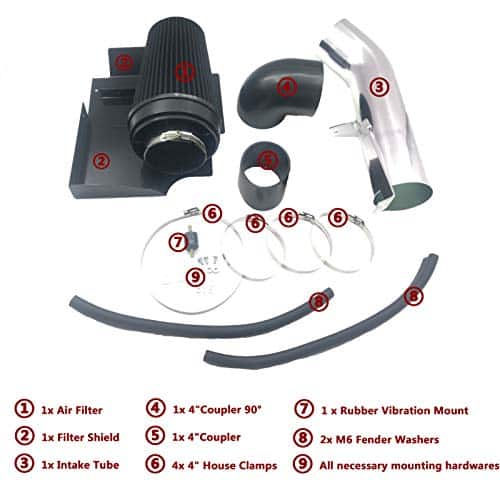 Ajuste: Apto para Cadillac Escalade 2002-2006 con motor V8 de 5.3L/6.0L. Apto para Avalanche 1500 2002-2006 con motor V8 de 5.3L. Apto para Suburban 1500/2500 2000-2006 con motor V8 de 5.3L/6.0L. Apto para Tahoe 2000-2006 con motor V8 de 4.8L/5.3L. Apto para Silverado 1500/1500 HD 1999-2006 con motores de 4.8L/5.3L/6.0L. Apto para Silverado 2500/2500 HD 1999-2006 con motores de 5.3L/6.0L. Apto para Silverado 3500 2001-2006 con motor V8 de 6.0L. Apto para Silverado SS 2003-2006 con motor V8 de 6.0L. Apto para GMC Sierra 1500/1500 HD 1999-2006 con motores de 4.8L/5.3L/6.0L. Apto para GMC Sierra 2500/2500 HD 1999-2006 con motores de 5.3L/6.0L. Apto para GMC Sierra 3500 2001-2006 con motor V8 de 6.0L. Apto para GMC Sierra Denali 2002-2006 con motor V8 de 6.0L. Apto para GMC Yukon Denali 2001-2006 con motor V8 de 6.0L. Apto para GMC Yukon Denali XL 2001-2006 con motor V8 de 6.0L. Paquete incluye: 1x Escudo térmico de acero, 1x Filtro de aire de alto flujo, 1x Manguera de silicona de alta calidad de 4″, 1x Manguera de silicona de alta calidad de 4″ 90 y todas las piezas necesarias.