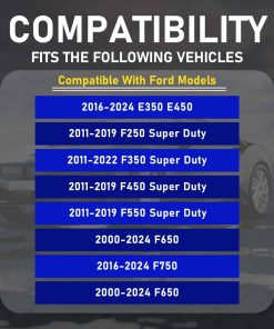 2. Compatibilidad de Vehículos: Compatible con Ford 2016-2024 E350 E450, 2011-2019 F250 Super Duty, 2011-2022 F350 Super Duty, 2011-2019 F450 Super Duty, 2011-2019 F550 Super Duty, 2000-2024 F650, 2016-2024 F750, 2018-2023 F53 F59, consulte el catálogo para más detalles de aplicación.
