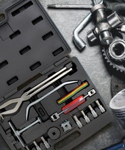 Ya no tendrás que luchar para quitar los sensores de oxígeno que se encuentran fuera de alcance debido a obstáculos porque el Kit de Herramientas de Compresor de Pastillas de Freno ABN se adapta tanto a sistemas de disco como de tambor y cubre la mayoría de tamaños de rodamientos y sellos. Algunas de las piezas de la herramienta de compresor del calibrador de freno son específicas para frenos de disco, como el retractor del pistón del calibrador. Si tienes frenos de disco traseros y un freno de estacionamiento que utiliza los calibradores traseros, necesitarás la herramienta en forma de cubo para girar y retraer el pistón del calibrador. Este juego de herramientas de freno incluye una herramienta de ajuste de freno de tambor, alicates de resorte de freno, zapato de freno universal, herramienta de resorte de fijación, herramienta de pistón de freno de disco, esparcidor de pastillas de freno de disco, medidor de grosor de revestimiento de freno, 8 controladores de socket bit (h6, h7, h8 y h10 hex; t40, t45, y t50 estrella) y un estuche para transportar.