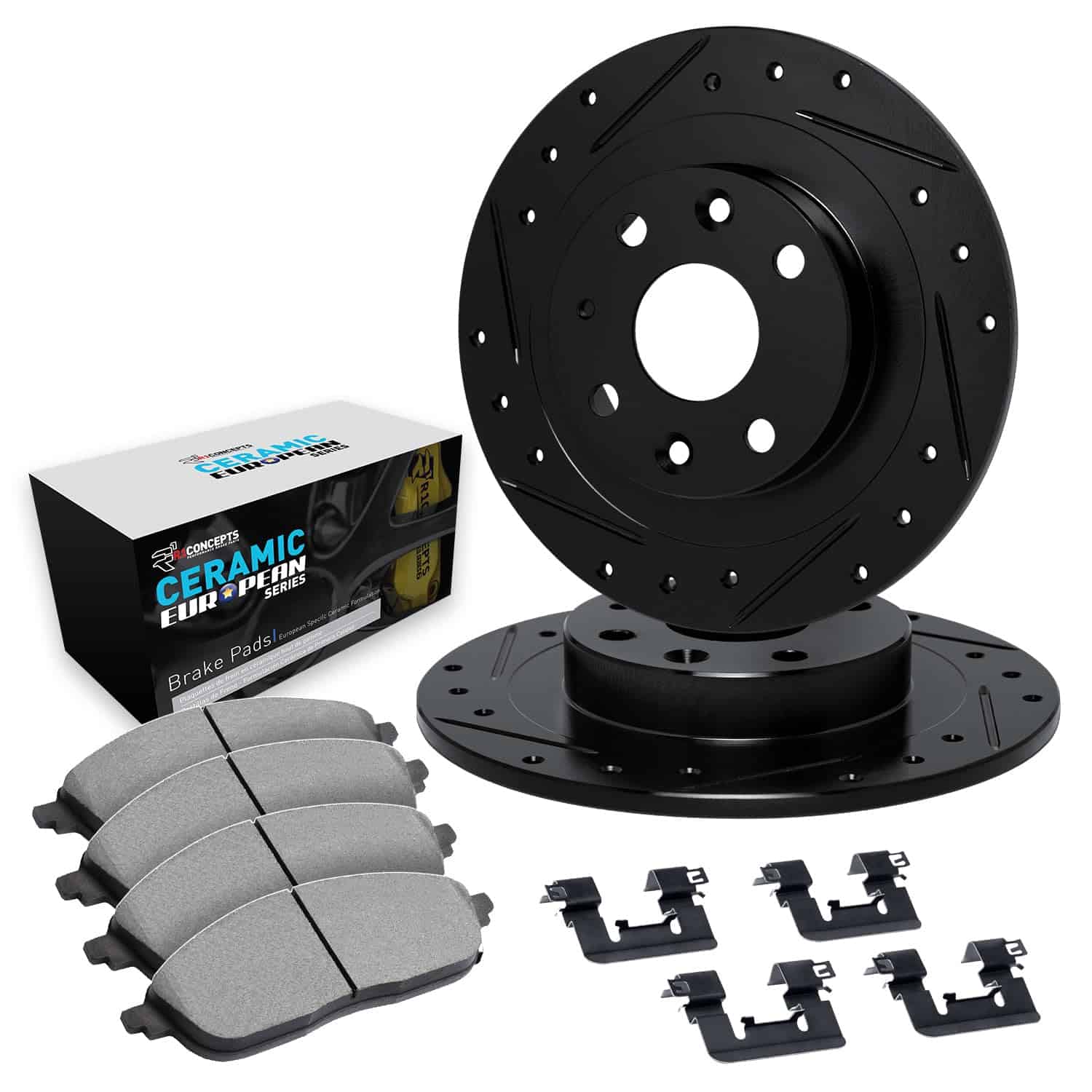 1. Kit de Frenos Completo de Repuesto: El Kit de Frenos Serie Carbono de R1 Concepts viene con (2) discos de freno de alto rendimiento, (4) pastillas de freno de rendimiento y kit de hardware.