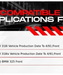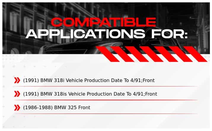 Aplicaciones compatibles para: (1991) BMW 318i Fecha de Producción del Vehículo Hasta 4/91; Delantero (1991) BMW 318is Fecha de Producción del Vehículo Hasta 4/91; Delantero (1986-1988) BMW 325 Delantero