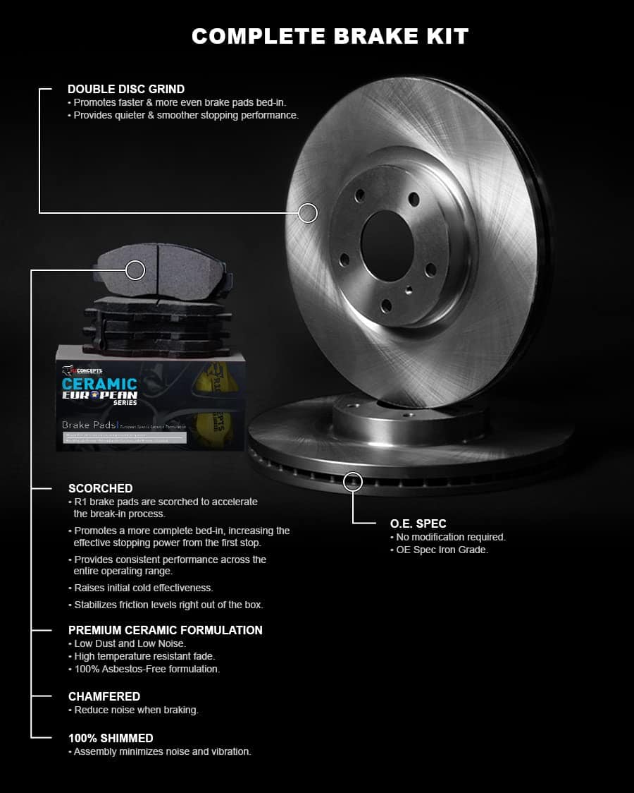 El Kit de Frenos Traseros R1 Concepts eLine Series viene completo con (2) discos de freno de alto rendimiento y (4) pastillas de freno de rendimiento. Estos discos de freno premium están formulados con especificaciones de hierro fundido G3000/G11H18 para igualar las especificaciones OEM en cuanto a durabilidad, fiabilidad y estabilidad.