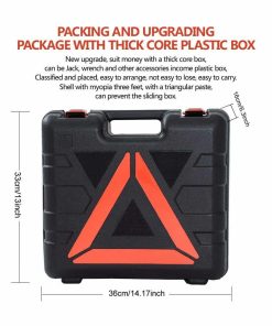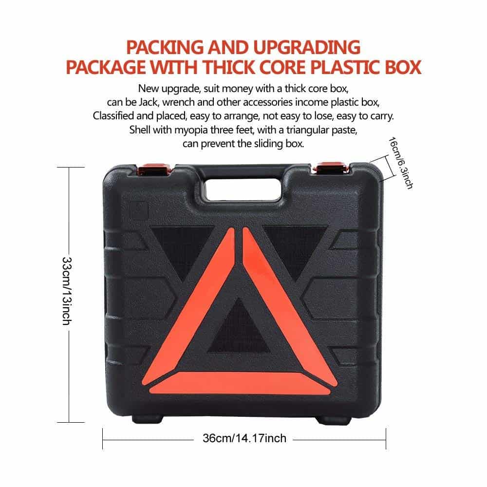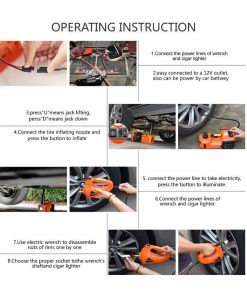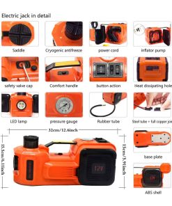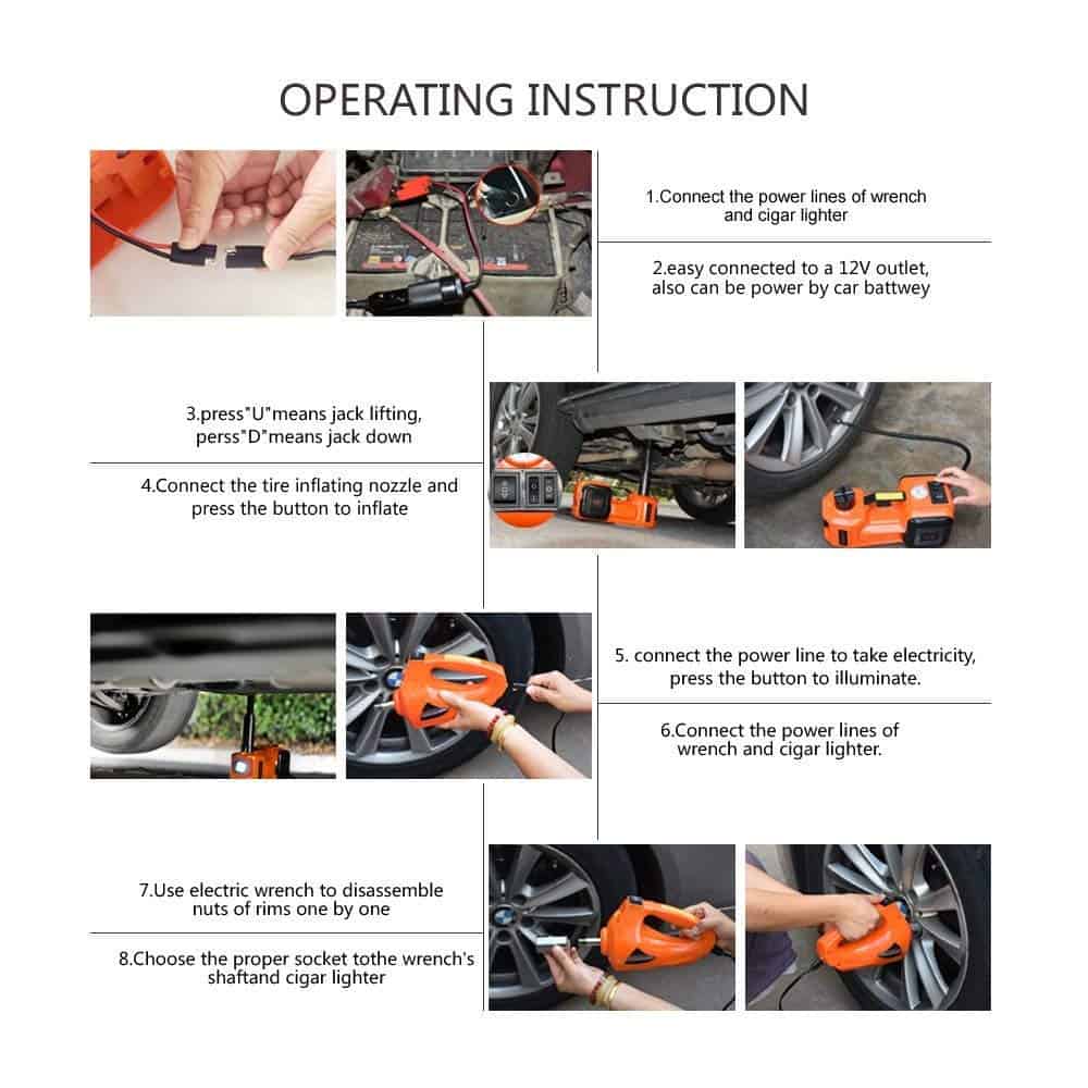 3. CONVENIENTE: El gato eléctrico para automóviles tiene una bomba infladora de neumáticos instalada, no es necesario preocuparse por el neumático desinflado. Y la caja de almacenamiento compacta y organizada también está equipada con una llave de impacto eléctrica, luz LED, cable de alimentación, cable de pinza de batería, guantes, etc.