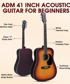 4. MANTÉNTE AFINADO: Construido con máquinas de afinación hechas de aleación de metal de alta calidad, cuerdas de bronce fosforado con núcleo hexagonal de acero al carbono de alta dureza y selleta de puente y ceja de hueso. 20 trastes de latón con marcas de posición en trastes 3º, 5º, 7º, 9º, 12º, 15º y 17º en el mástil y parte superior del diapasón. La guitarra acústica ADM es fácil de afinar y mantiene la afinación después de algunas veces de ajuste de cuerdas.