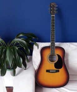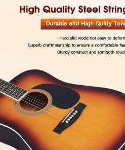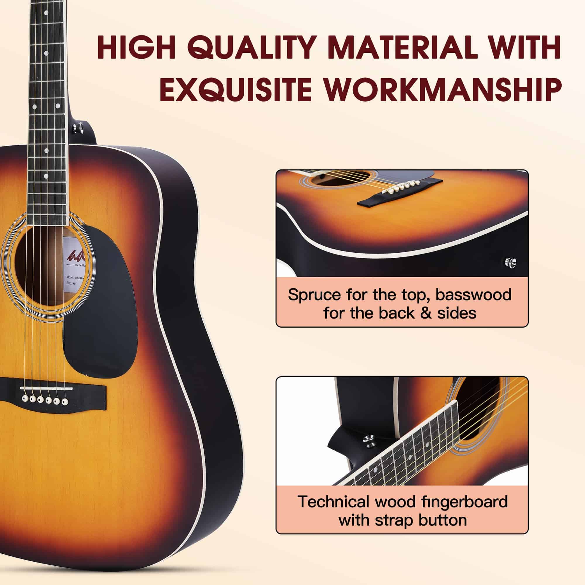 1. MATERIAL DE ALTA CALIDAD – Presenta una tapa de madera de abeto seleccionada, la parte trasera y los laterales de tilo le brindan un sonido más rico y brillante. El diapasón y puente de madera técnica proporcionan una sensación de juego cómoda; las máquinas de afinación de alta calidad son de estilo con clavijas de ajuste cubiertas, hechas de aleación de metal y mantienen su guitarra acústica afinada. Todas las guitarras acústicas fueron hechas a mano por trabajadores profesionales y experimentados.