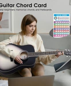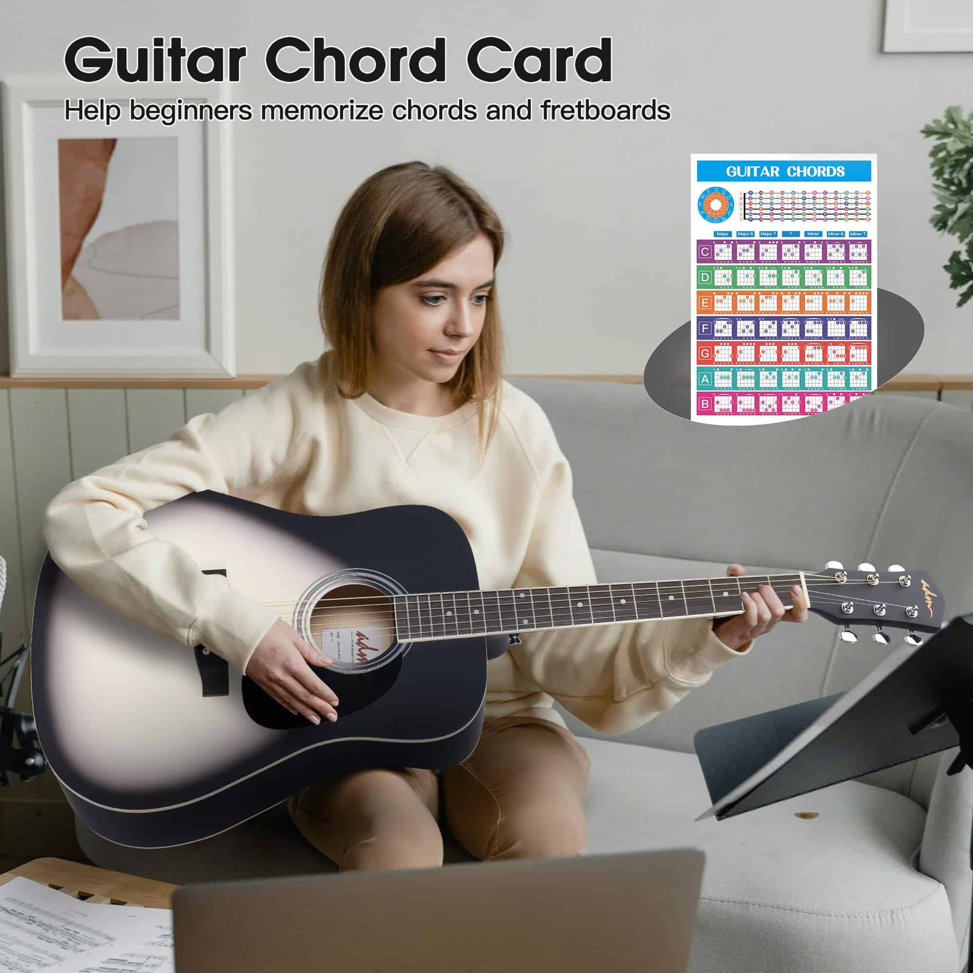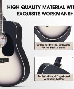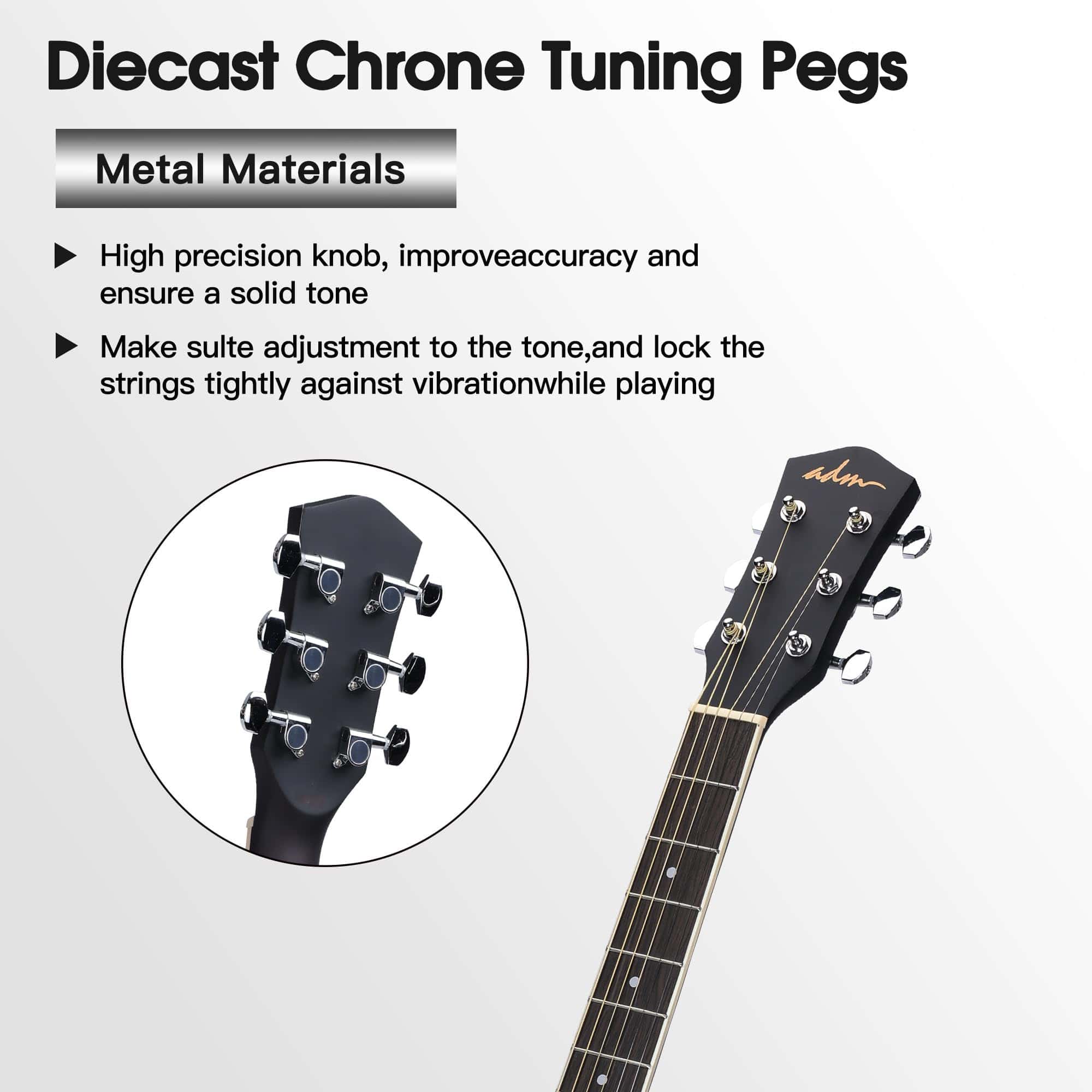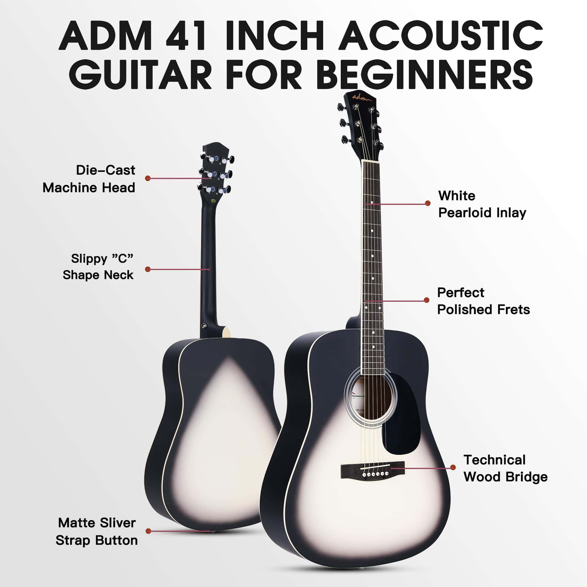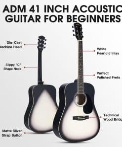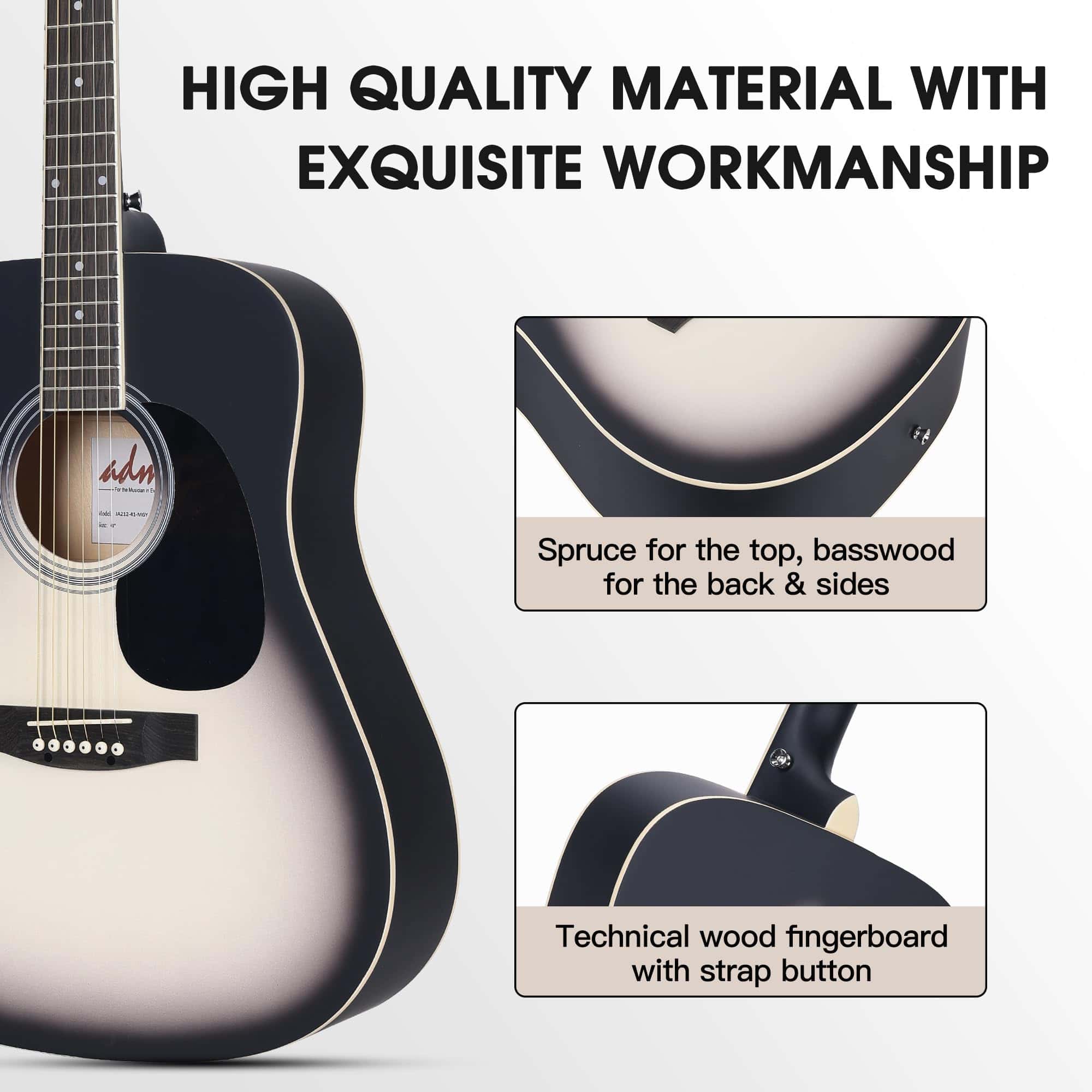 Kit de Guitarra Acústica ADM Dreadnought con Lección Gratis para Principiantes Adultos Adolescentes Set de Inicio de Guitarra Acústica Tamaño Completo con Estuche Correa Afinador Cejilla Protector para Golpeador Atril de Música, Diestro (Gris, 41 Pulgadas). Presentado con madera de abeto seleccionada para la parte superior y madera de tilo para la parte trasera y laterales, este kit de guitarra acústica te brinda un sonido más rico y brillante. El diapasón y puente de madera técnica ofrecen una sensación de juego cómoda, mientras que las máquinas de afinación de alta calidad mantienen tu guitarra acústica en sintonía. Todas las guitarras acústicas ADM fueron hechas a mano por trabajadores profesionales y experimentados para garantizar la máxima calidad y artesanía. El kit completo para principiantes incluye una funda impermeable acolchada para un almacenamiento seguro y fácil transporte, afinador digital fácil de usar (batería no incluida), cuerdas adicionales, correa ajustable, púas, cejilla, colgador y soporte para guitarra, atril de música, bolsa de almacenamiento, tarjeta de acordes de guitarra y una Tarjeta de Lecciones Gratuitas para comenzar a tocar de inmediato. Ideal tanto para principiantes como para músicos en ciernes, estudiantes o jóvenes que desean aprender a tocar la guitarra, este kit de guitarra de cuerda acústica es un regalo perfecto para cumpleaños, Navidad, Día de Acción de Gracias, Día del Niño, Graduación, Inauguración, etc. Construida con máquinas de afinación de metal de aleación de alta calidad, cuerdas de bronce fosforado de alta calidad con núcleo de hexagonal de acero con alto contenido de carbono, selleta de puente y cejuela de hueso de alta resistencia, la guitarra acústica ADM es fácil de afinar y se mantiene afinada después de varias afinaciones. La guitarra aún no ha sido afinada debido al transporte, por lo que se recomienda afinarla y mantener la afinación frecuentemente, ya que las nuevas cuerdas y la madera necesitan adaptarse a la tensión. ¡Comienza tu viaje musical con el Kit de Guitarra Acústica ADM Dreadnought y disfruta de la música en cualquier momento y lugar!