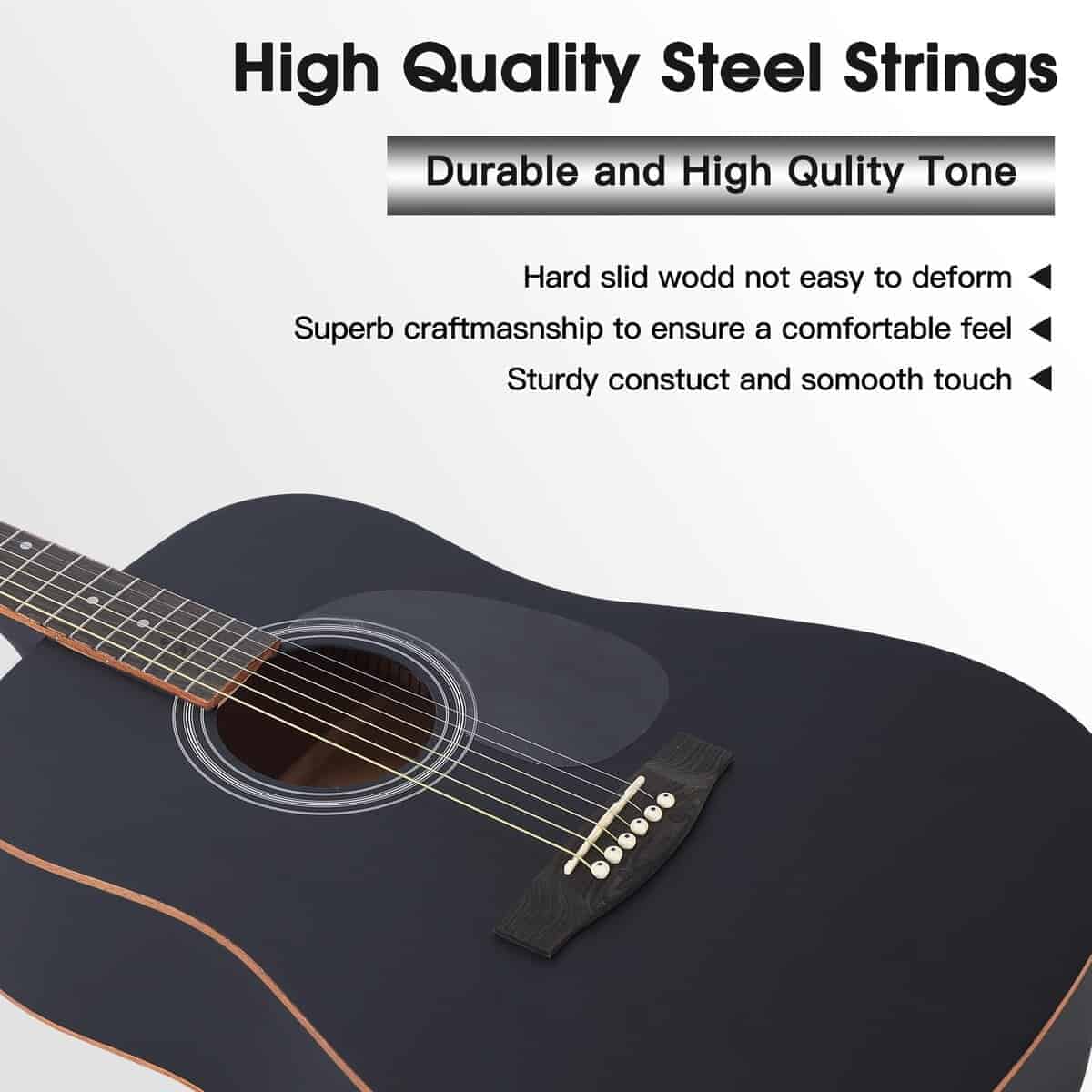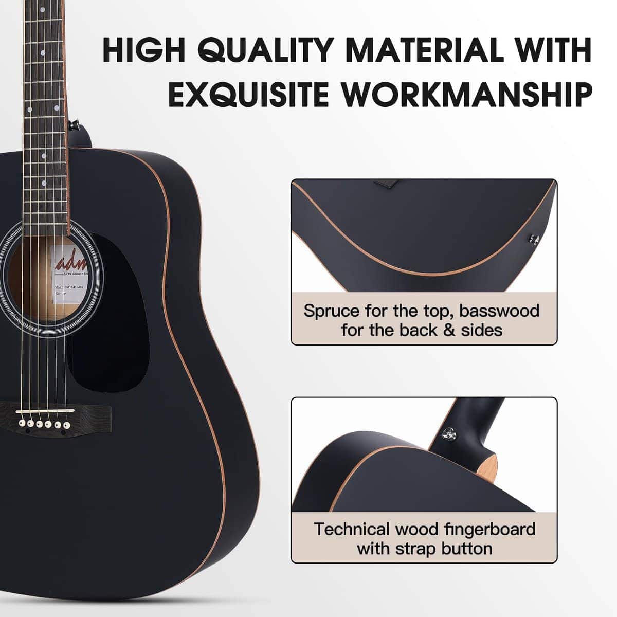1. MATERIAL DE ALTA CALIDAD – Fabricado con madera de abeto seleccionada para la tapa, madera de tilo para la parte trasera y los lados que te proporcionan un sonido más rico y brillante. El diapasón y puente técnicos de madera proporcionan una sensación de juego cómoda; las clavijas de afinación de alta calidad son de estilo cubierto, fabricadas en metal de aleación y mantienen tu guitarra acústica afinada. Todas las guitarras acústicas fueron hechas a mano por trabajadores profesionales y experimentados.