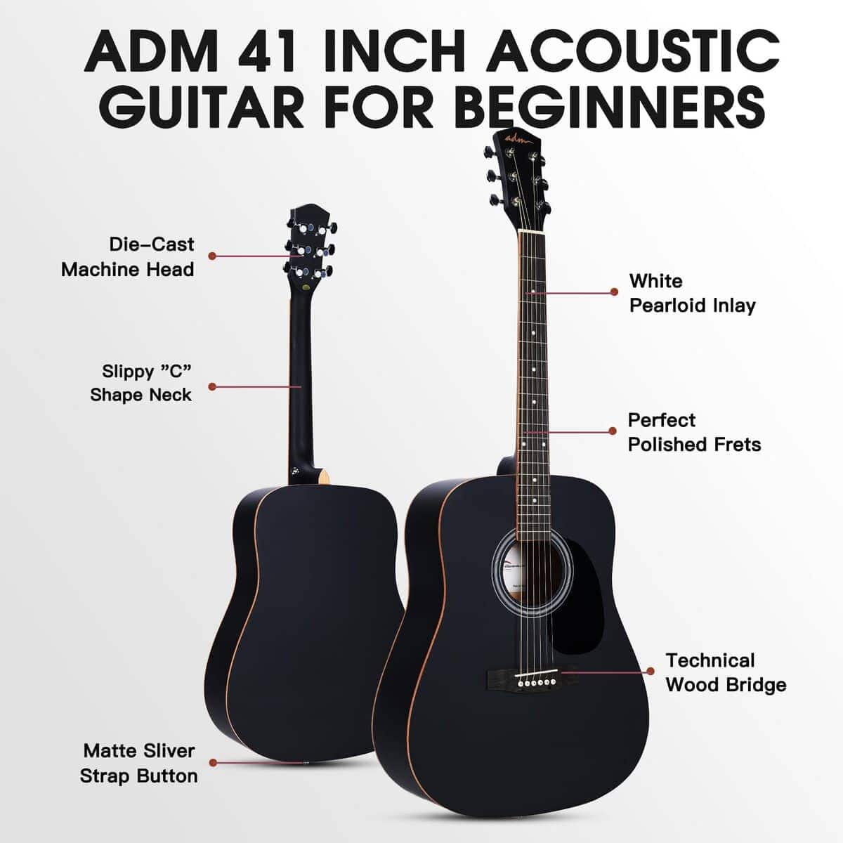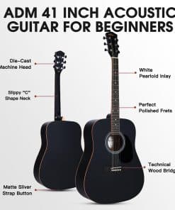 4. MANTENTE AFINADO: Construido con clavijas de afinación de metal de aleación de alta calidad, cuerdas de bronce fosforado con núcleo hexagonal de acero al carbono de alta dureza, cejuela de puente de hueso y nuez de hueso. 20 Trastes de latón con marcas de posición de trastes en la 3ra, 5ta, 7ma, 9na, 12va, 15ta y 17ma trastes en el mástil y la parte superior del diapasón. La guitarra acústica ADM es fácil de afinar y mantiene la afinación después de algunas veces de ajustar las cuerdas.