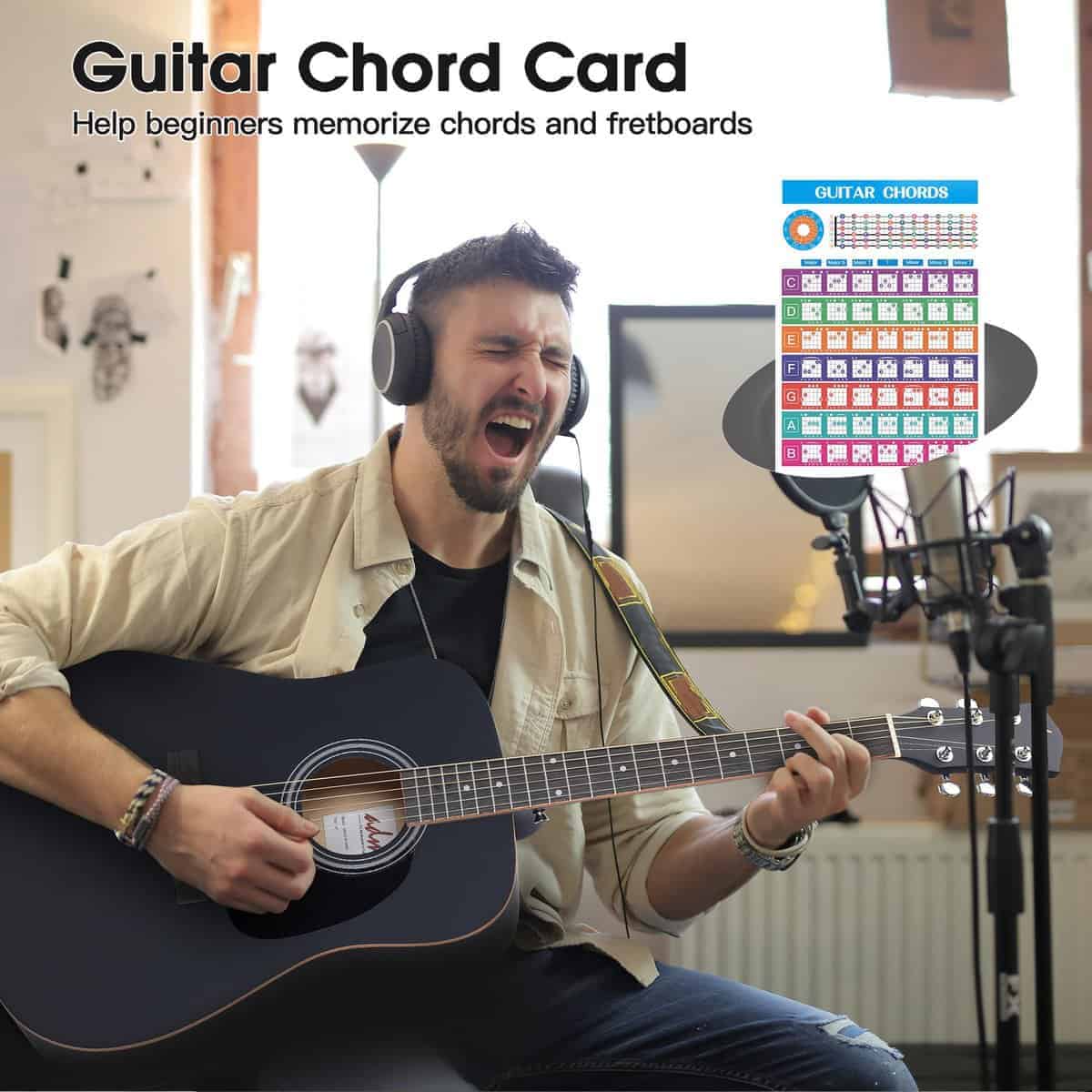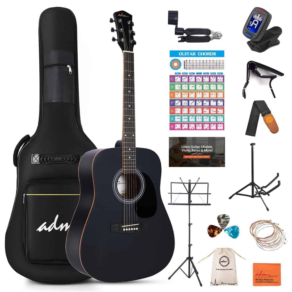2. KIT DE GUITARRA PARA PRINCIPIANTES MÁS COMPLETO Y LECCIÓN GRATIS – El kit definitivo para un músico principiante, esta guitarra clásica acústica dreadnought de 41 pulgadas para diestros viene con accesorios esenciales para principiantes. Incluye una funda acolchada impermeable, afinador digital (batería no incluida), cuerdas adicionales, correa, púas, cejuela, colgador o soporte para guitarra (alternando entre stock nuevo y viejo), soporte de música, bolsa de almacenamiento, tarjeta de acordes de guitarra y tarjeta de lecciones gratis, etc.