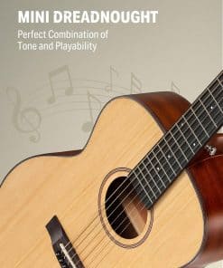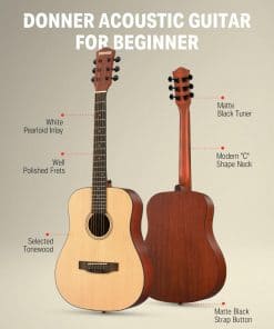 El kit de guitarra acústica Donner 3/4 es la opción perfecta para músicos principiantes y viajeros que buscan una guitarra de alta calidad a un precio asequible. Este paquete completo incluye todo lo que un principiante necesita para comenzar a tocar de inmediato. La guitarra acústica de 36 pulgadas cuenta con un cuerpo Dreadnought que proporciona un tono resonante y cálido, perfecto para una variedad de estilos musicales. Con una tapa de abeto y costados y parte trasera de caoba laminada, esta guitarra ofrece una calidad de sonido superior. Además, viene equipada con una variedad de accesorios, como una funda acolchada, afinador digital, cejuela, pack extra de cuerdas, púas y paño de limpieza, para satisfacer todas las necesidades de los principiantes. Construida con materiales de alta calidad y diseñada para proporcionar una excelente jugabilidad, la guitarra acústica Donner es fácil de afinar y cómoda de tocar, lo que la convierte en la elección ideal para aquellos que buscan iniciar su viaje musical con el pie derecho.