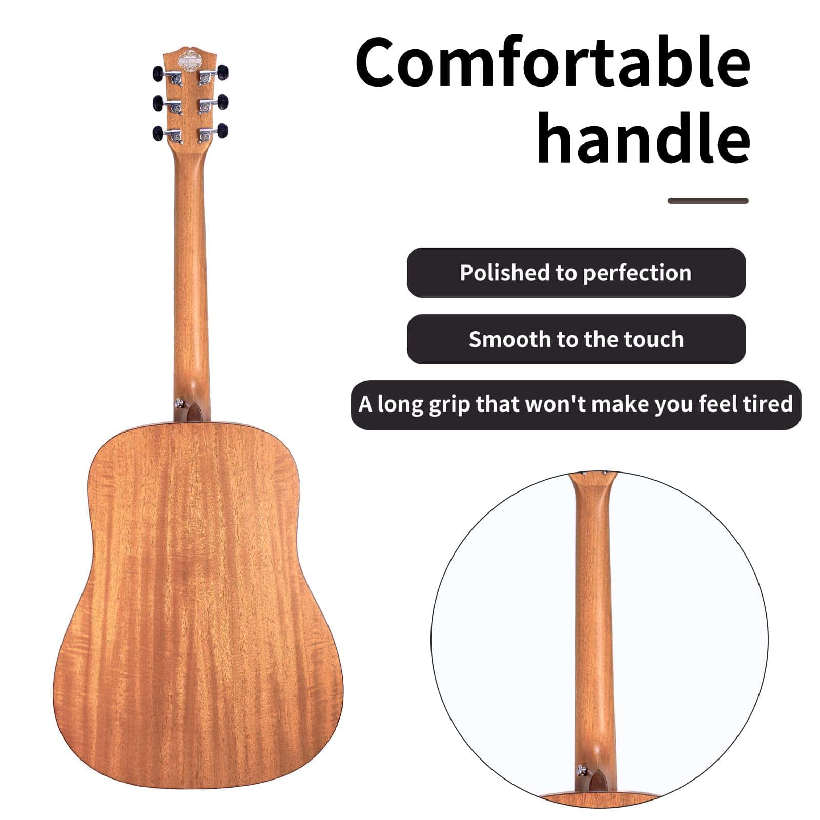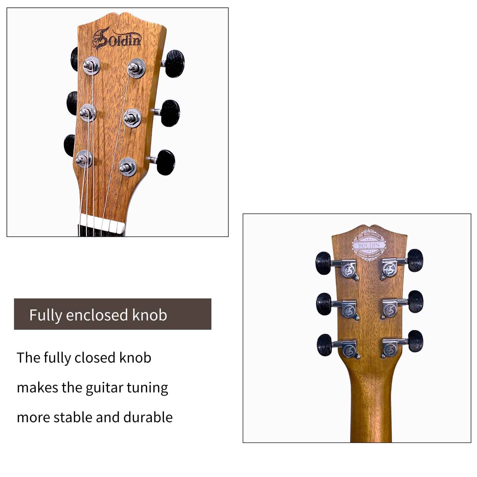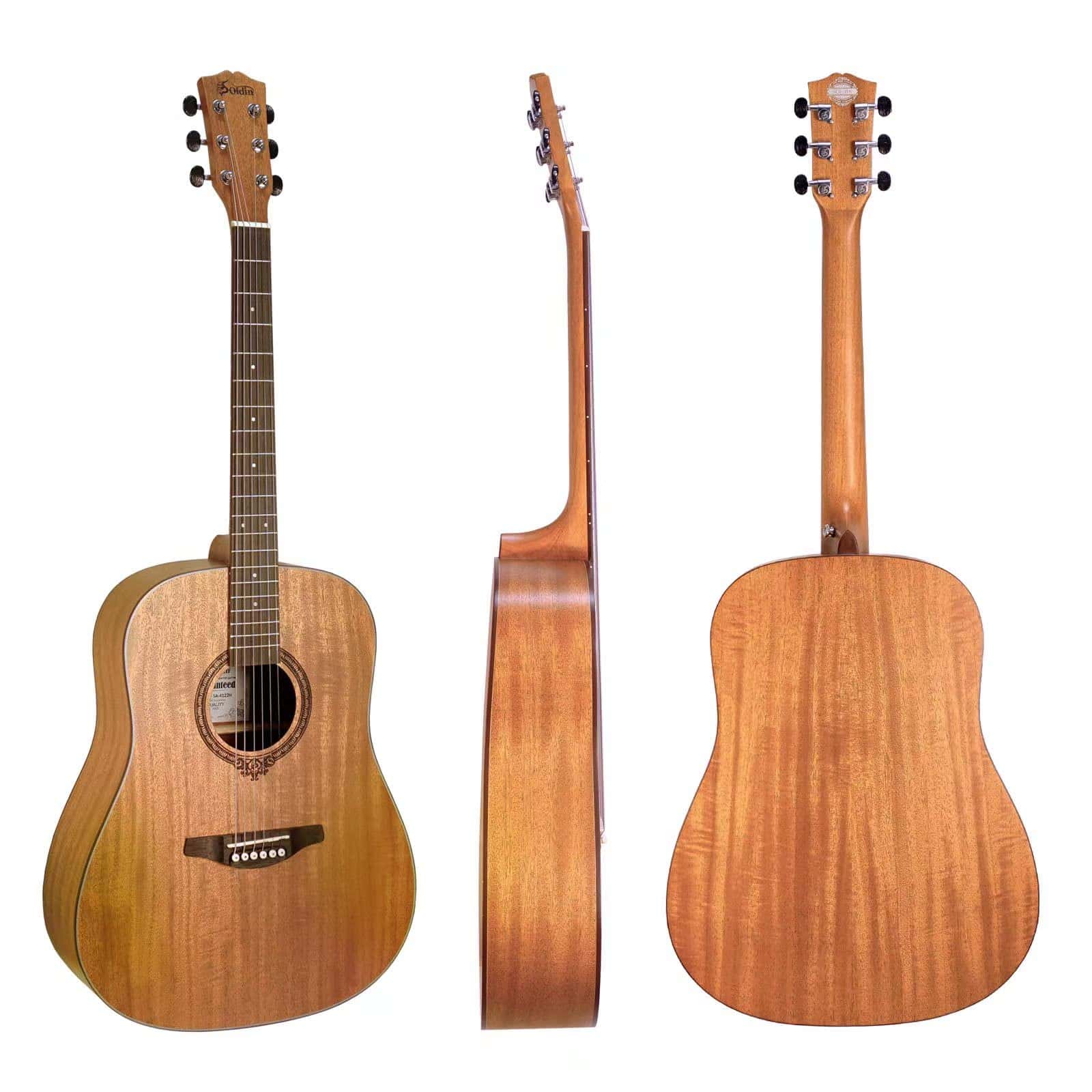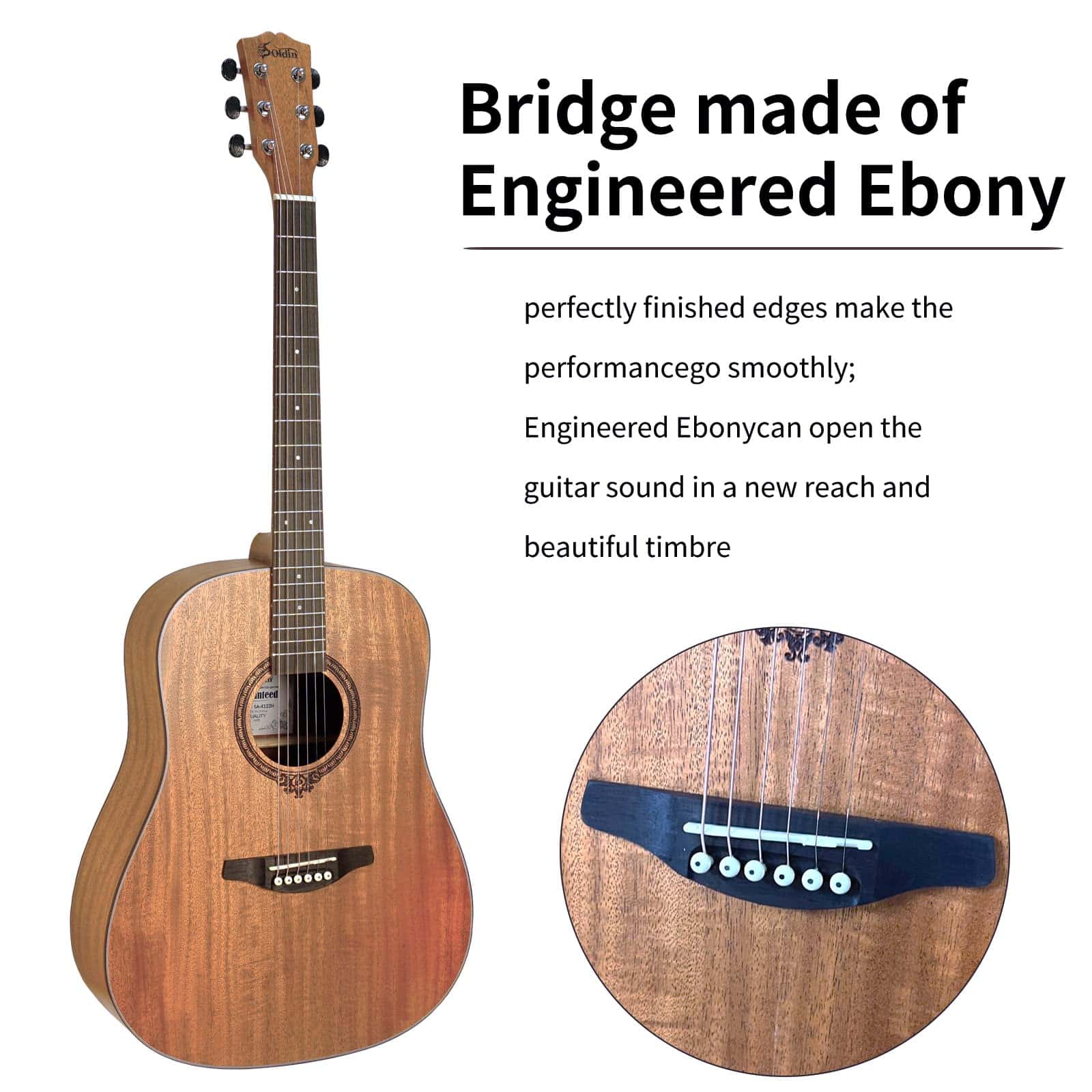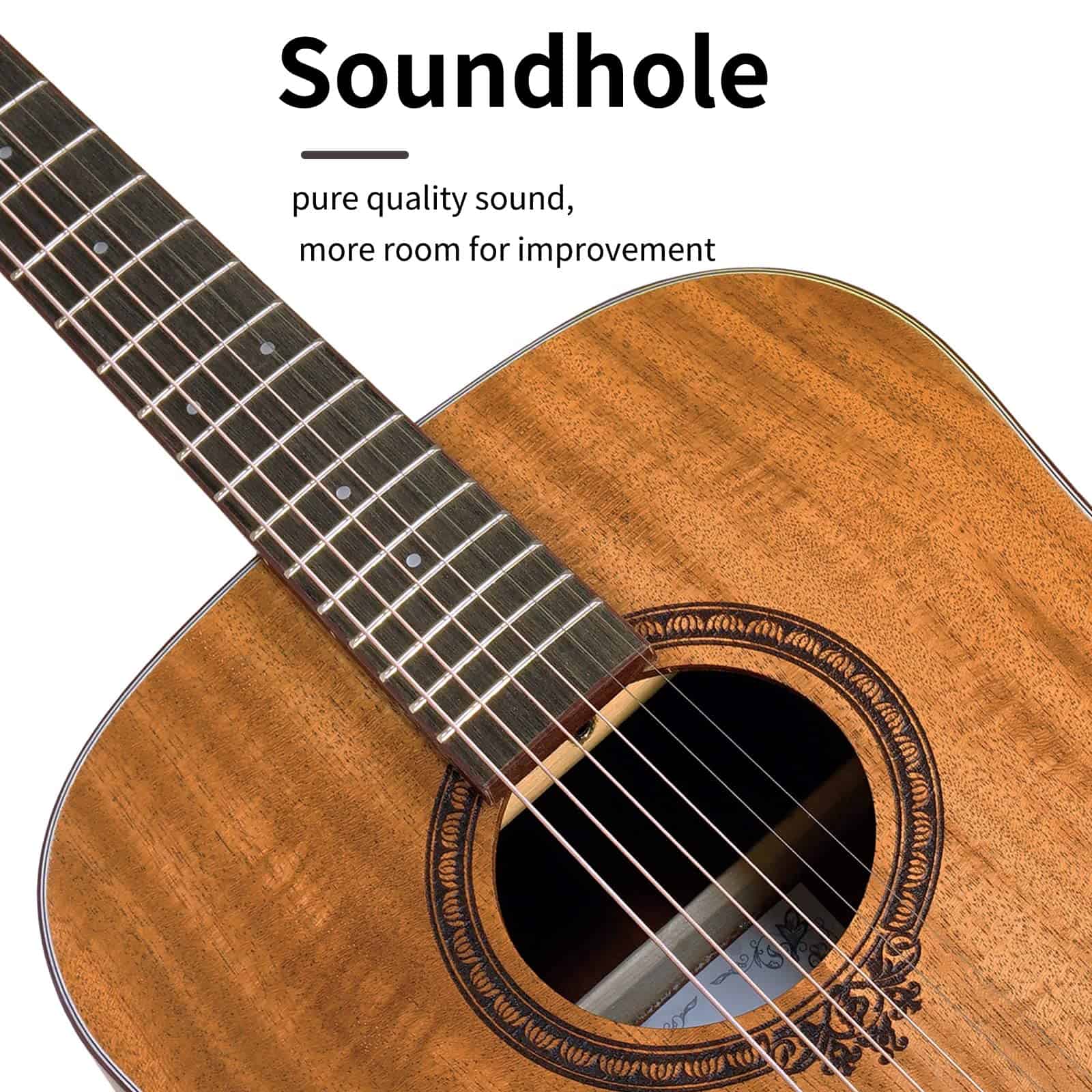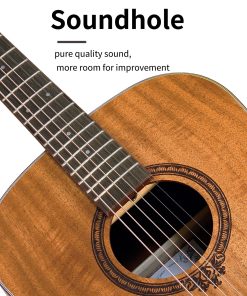Top, back and sides are made of mahogany with laser sound hole flower. Body with X bracing brings you richer and brighter sound. Constructed with phosphor bronze strings with High Carbon Steel Hex Core and high hardness bridge saddle and bone nut, Soldin guitar is easy to tune and hold tune after first tune-up of strings. High density wood fingerboard and bridge offers both sturdy construct and smooth touch Soldin guitar lend themselves well to beginners and younger players while also suiting accomplished players who require a more articulate-sounding guitar suitable for finger-style playing. This guitar includes a free accessories package of everything you may need such as a gig bag, picks, guitar strap, capo, clip-on digital tuner with LED (1xCR2032 battery required, but for policy reasons the battery is not included), cleaning cloth. This is the best musical instrument gift ever. The Soldin guitar has a simple and elegant look, not complicated, but it is deeply loved by the public. We have improved the quality of guitars to the highest standards, which makes people love it. Owning a Soldin guitar will make your life more interesting and fun.