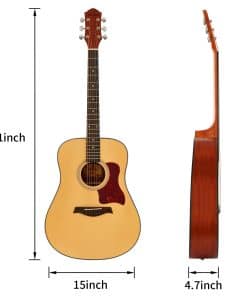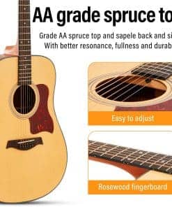 El Kit de Guitarra Acústica AODSK incluye una guitarra de 41 pulgadas con tapa de pícea, funda con capas acolchadas, correa, afinador de pinza, capo, juego de cuerdas y dos extras, púas, paño de limpieza y llave de guitarra. Estas productos son ideales para principiantes para mantener sus guitarras en óptimas condiciones. Las guitarras están disponibles en dos colores: guitarra negra y guitarra de color natural. Los colores ricos son adecuados para que diferentes grupos de personas elijan. La guitarra adopta una tecnología de pulverización avanzada, que es cómoda de manejar y conserva el excelente efecto de sonido de la guitarra. El panel superior de la guitarra AODSK está hecho de Pícea, lo que brinda un sonido más cálido y mejor. El refuerzo interno del cuerpo principal adopta la estructura en forma de X cuidadosamente diseñada por el diseñador, lo que aporta una calidad de sonido y estabilidad más estables en la estructura de la guitarra. Las guitarras acústicas AODSK están diseñadas por profesionales para optimizar el diseño del mástil de la guitarra y la separación profesional de las cuerdas para facilitar su uso manteniendo una sensación cómoda, con marcas laterales, adecuadas para principiantes y amantes de la guitarra. Garantía de postventa: reembolso incondicional por problemas de calidad, puede comprar nuestros productos con tranquilidad.