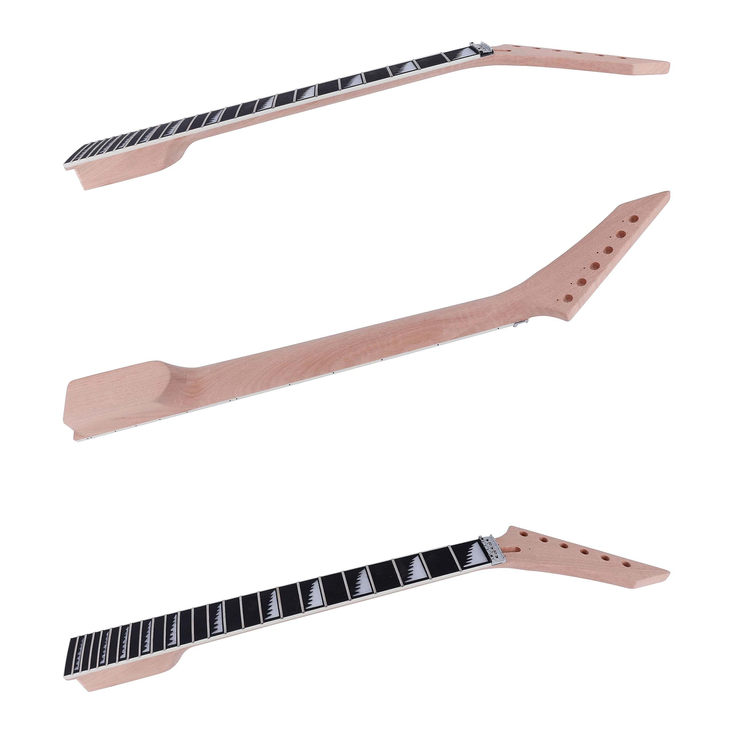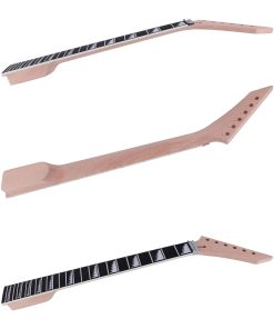 Kit de Guitarra Eléctrica DIY Leo Jaymz en Estilo AL – Este kit de guitarra eléctrica estilo AL viene con un mástil encolado. El hermoso cuerpo de caoba ha sido pulido a fondo y rociado con barniz de base, lo que reduce el trabajo del comprador para la pintura del cuerpo. Todos los huecos están perforados para pastillas y perillas de control. El diapasón de ébano está incrustado con patrón de sierra para un toque único. Viene con clavijas de máquina en un lado para un cabezal en forma. El sistema de trémolo de doble vía con una barra de trémolo agrega diversión al tocar. Los cables enchufables eliminan la molestia de la soldadura. El lado único engrosado se puede pegar con papel de lámina de cobre, y el ruido puede reducirse de manera efectiva pegándolo en posiciones como el compartimiento de cables y la ranura de captación. Con una longitud de escala de 25.5″ y un mástil de arce en 24 trastes, este kit de guitarra te proporcionará la base perfecta para tu próxima creación musical.