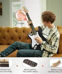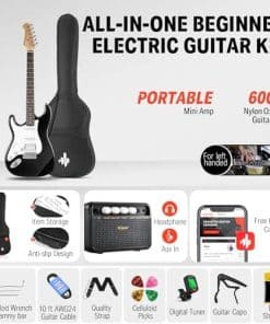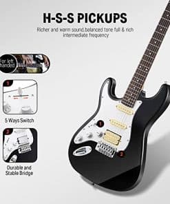 Especificaciones de DST-1BL Color: Negro Tamaño: Tamaño completo de 39 pulgadas Orientación de la mano: Zurdos Pastillas: S-S-H Controles: 1V 2T, 5 posiciones Material del cuerpo: AAA Madera maciza de Basswood africano Material del mástil: AAA Arce canadiense Forma del mástil: Forma «C» Incrustaciones de posición: Marcas de puntos Número de trastes: 20 Clavijas de afinación: Acero fundido en troquel Especificaciones del amplificador 3W MINI Color: Negro Salida máxima: 3 vatios Entrada: Entrada de guitarra Entrada AUX Salida: Salida para auriculares de 3.5mm Luces indicadoras: Luz indicadora de encendido Batería incorporada: Paquete de batería 18650 (continuará tocando durante 3 horas) Fuente de alimentación: Adaptor DC 5V Dimensiones: 134(L) 97(W) 85(H)mm Peso neto: 490g Paquete incluido 1 x Guitarra eléctrica DST-1BL 1 x Amplificador de guitarra eléctrica 3W 1 x Bolsa grande 1 x Correa de guitarra 1 x Capo de guitarra 1 x Cuerdas de guitarra 1 x Afinador Donner DT-2 4 x Púas de guitarra