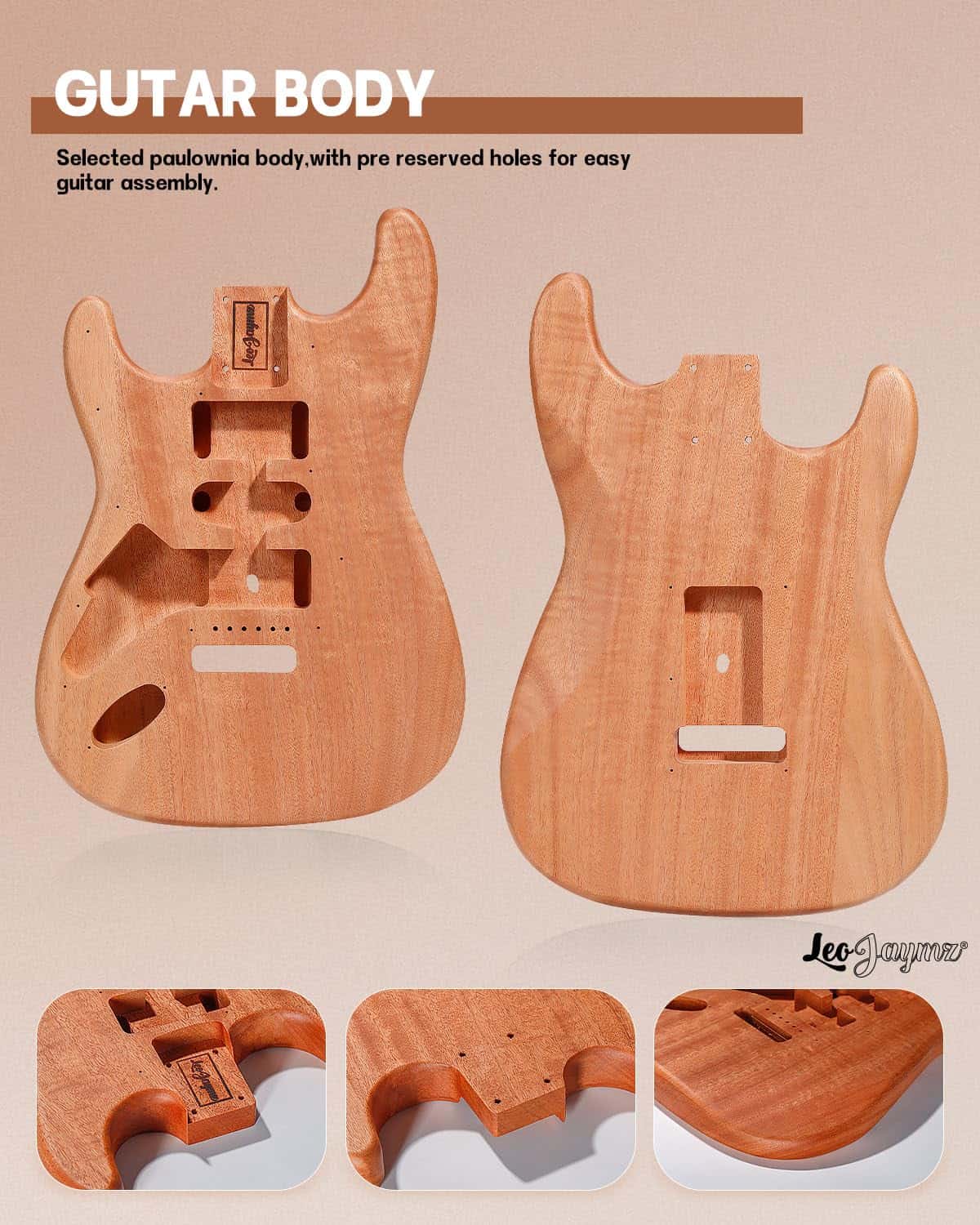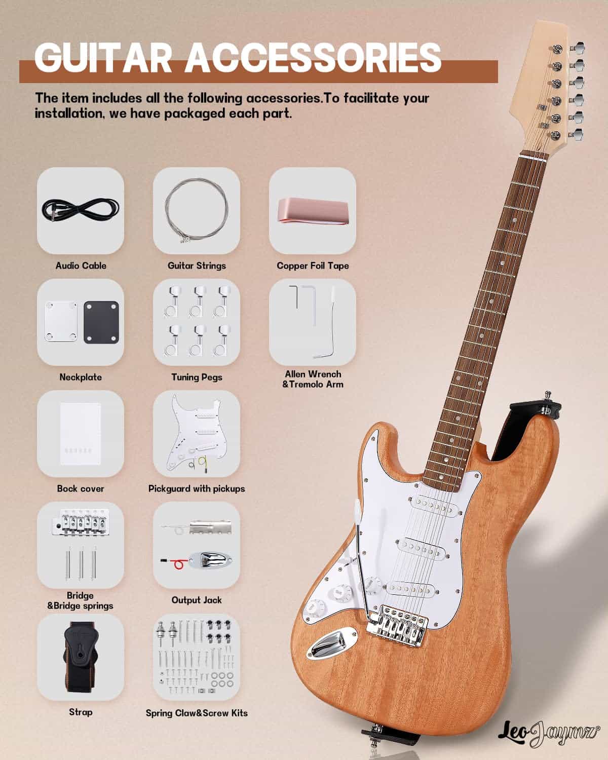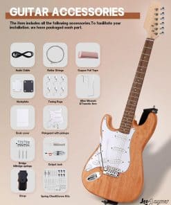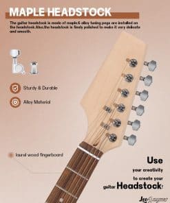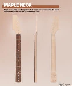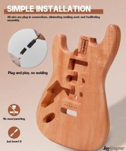 Este es un kit de guitarra eléctrica estilo DIY ST lefthand. Cuerpo de caoba sólida y mástil de arce. El hermoso cuerpo de caoba ha sido pulido profundamente y rociado con barniz, lo que reduce el trabajo del comprador para pintar el cuerpo. Todos los cavidades perforadas para pastillas y perillas de control. Diapasón de madera laurel con incrustaciones de perla de 6mm. Clavijas de un lado para una pala en forma. Todo el cableado y tornillos están incluidos. El kit incluye una correa para guitarra, así como bloqueos de correa para guitarra con un sistema de retención rápida de seguridad. Escala de 25.5″ y mástil de arce en 21 trastes. El lado único engrosado puede pegarse con papel de lámina de cobre, y el ruido puede reducirse efectivamente pegándolo en posiciones como el compartimento de cables y la ranura de la pastilla.