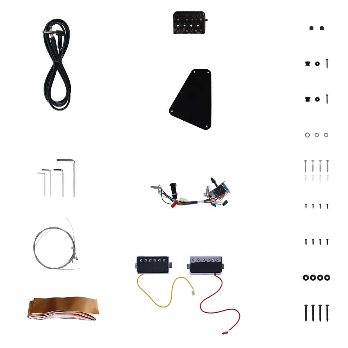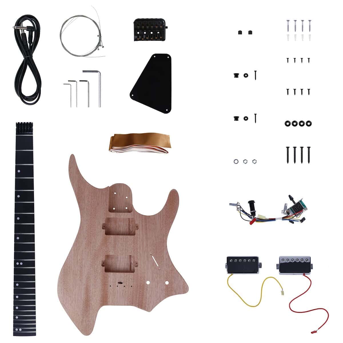 1. Kit de guitarra eléctrica DIY estilo Headless con mástil atornillado. 2. El hermoso cuerpo de caoba ha sido pulido profundamente y rociado con barniz de fondo, lo que reduce el trabajo del comprador para pintar el cuerpo. 3. Mástil de arce y caoba con diapasón de ébano y incrustaciones de perlas de 6 mm. 4. Todos los cables y tornillos están incluidos. 5. Escala de 25.5″ y mástil de arce con 24 trastes. 6. El lado único engrosado se puede pegar con papel de aluminio de cobre, y el ruido se puede reducir eficazmente al pegarlo en posiciones como el compartimento de cables y la ranura de la pastilla. 7. 2 pastillas Humbucker sin bastidor y puente especial para guitarra headless. 8. Los cables enchufables eliminan la molestia de la soldadura.