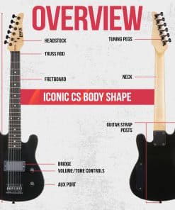 Elige, rasgue y toca como un profesional. Da el salto de lecciones a solos en poco tiempo con la Guitarra Eléctrica Serie CS de 30” de LyxPro. Nuestro set para principiantes llega con todos los elementos esenciales que necesitas para tocar como un profesional, incluyendo una impresionante Guitarra de madera maciza, cable de amplificador, colección de púas y guía de entrenamiento detallada con instrucciones para el manejo, mantenimiento y aprendizaje de este legendario instrumento. Las pastillas de bobina simple producen ese sonido característico con una respuesta clara, dinámica, mientras los sencillos controles de volumen/tono te permiten ajustar tu sonido. Para un valor que puedes escuchar, simplemente enchúfate a tu amplificador preferido a través del cable proporcionado, toma una púa y rasguea. El sueño comienza aquí – ¡agrega una Guitarra Eléctrica Serie CS de LyxPro a tu carrito hoy! Qué obtienes – 1 x Guitarra Eléctrica Serie CS – 1 x Cable de Amplificador – 6 x Púas – 1 x Guía de Aprendizaje Especificaciones y detalles – Tamaño de la guitarra: 30” – Cuerpo: madera de Paulownia – Diapasón: madera de ingeniería – Mástil: arce canadiense – Cuerdas: acero niquelado – Controles de pastillas: 5 vías