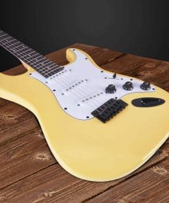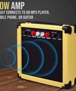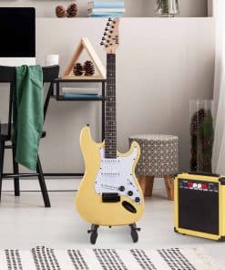 Todo lo que necesitas para comenzar a tocar Este kit incluye todo lo que necesitas para empezar a tocar Guitarra eléctrica de tamaño completo de 39″ Amplificador de 20W Afinador digital de pinza 6 cuerdas 2 púas Barra de trémolo Correa para el hombro Bolsa de transporte Amplificador de 20W Este amplificador de 20W es perfecto para el guitarrista principiante. Completo con conector para auriculares y sobremarcha, obtendrás un gran sonido de calidad. Potencia del Amplificador: 20W Altavoz: 6.5″/ 4 ohmios Ecualización: agudos, graves, ganancia, distorsión Conectores: auriculares, mp3 Dimensiones: 11.6″ x 11.2″ x 4.1″ (29.5 x 28.5 x 10.5cm) Peso: 5.7 libras (2.6kg) Afinador digital de pinza Tocar afinado es esencial para cualquier guitarrista. El afinador digital incluido en este kit asegura que tu guitarra esté perfectamente afinada cada vez que te sientes a tocar. Las instrucciones fáciles de seguir harán que la afinación sea pan comido. Afinador Digital de Pinza Frecuencia A4: 440Hz Elemento de Afinación: cromático, guitarra, bajo, violin, ukelele Rango de Afinación: 0A (27.5Hz) – 8C (4186.01Hz) Dimensiones: 2.1″ x 1.1″ x 3.1″ (55 x 30 x 80mm) Peso: 1.1 onzas (32g)