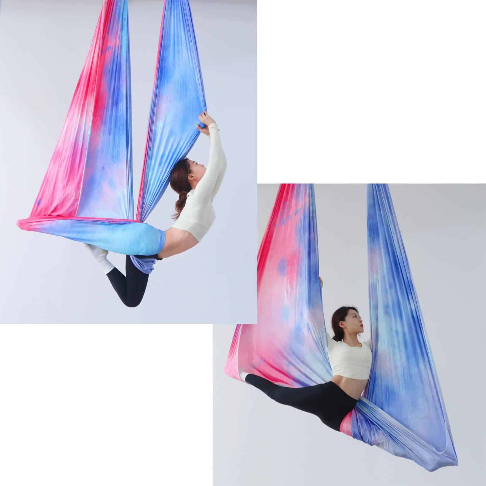 ¿De Qué Tipo de Tela Es la Hamaca? La hamaca de Yoga Aéreo está hecha de 5 metros de tela de Nylon Tricot 40-Denier, el mismo tipo de tela utilizada en las actuaciones de Cirque du Soleil. El Nylon Tricot 40-Denier es de estiramiento de dos vías, cuando se dobla como un columpio, y cuando te acurrucas dentro de la hamaca la tela cede lo suficiente para que se sienta cómoda para el cuerpo y la piel. ¿Viene Preanudado en el Mosquetón? No, no viene preanudado. Nuestro kit de hamaca de yoga aéreo incluye una guía de anudado de nudos, instrucciones paso a paso para hacer que la configuración sea segura y fácil de seguir. ¿Este Material Elástico Se Puede Acurrucar Completamente o Acostarse Completamente en Él? Sí, la tela cede, es una tela elástica. No es como el tipo de material de paracaídas utilizado a menudo en otros columpios de estilo yoga. ¿Las Lazadas Daisy Se Pueden Envolver Alrededor de una Viga Expuesta para Colgar el Columpio Sin Taladrar en la Viga? ¡Sí, puedes! Las cadenas daisy son muy fuertes y pueden ser utilizadas de esa manera. Recomendamos a menudo que uses el extremo sin lazo de la cadena daisy y lo pases a través de otro lazo después de envolverlo alrededor de la viga o poste. A medida que te acuestas en el columpio, causará tensión en el lazo formado alrededor de la viga/poste y te mantendrá en su lugar. ¿Qué Ancho Debería Usar Para Colgar el Columpio? La distancia de los hombros probablemente es la más segura y más soportante. Este Kit Funciona Perfecto Para: Yoga Aéreo, yoga swing, yoga sling, danza aérea, fitness aéreo, aire yoga, hamaca aérea, Yoga Anti-Gravedad, Yoga Unnata, Yoga de Suspensión, Yoga de Gravedad, Yoga Antigravedad, Yoga Volador, Pilates Aéreo, Pilates en hamaca.