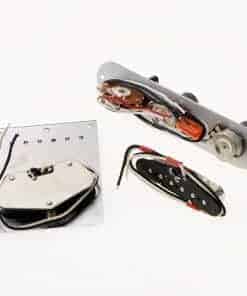 Este es un hermoso y muy bien hecho kit de hardware, incluyendo una placa de puente, una placa de control y una almohadilla para el cuello, cargado en una bonita caja. La placa de puente es de metal grueso con relieves, tiene 6 sillines de rodillo y una pastilla de bobina única. La pastilla suena limpia. La placa de control tiene un interruptor de 3 vías, los botones de volumen y tono son con parte superior de perla. El cuello con cubierta a juego, suena transparente. Adecuado para guitarras eléctricas de estilo Telecaster. Material: Cuproníquel, Alnico 5, fibra de acero. Especificaciones: Cuello: 9,7 K. Puente: 8k. Tamaño aproximado: 2.835 x 1.496 x 0.748 in. El paquete incluye: 1 placa de puente, 1 placa de control, 1 pastilla para el cuello.