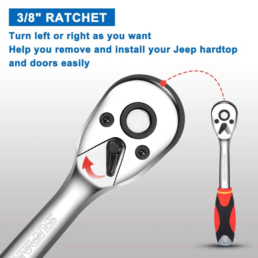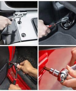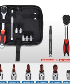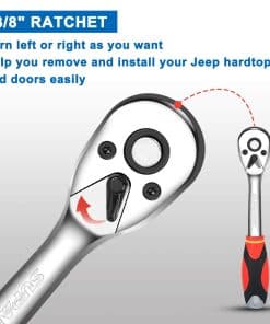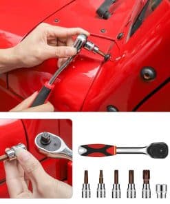 Este práctico kit de herramientas de desmontaje de puertas de SUPAREE es perfecto para los propietarios de Wrangler 1997-2019 2020. Fabricado con acero inoxidable de alta calidad y un proceso de pulido metálico para proteger contra la corrosión, este kit es resistente y duradero para garantizar la precisión del mantenimiento del vehículo. La bolsa de transporte de nylon negro portátil facilita su transporte y almacenamiento. El diseño del mango doblado del trinquete hace que el kit sea más seguro que los trinquetes rectos, proporcionando mucho par y suficiente espacio de oscilación para la punta Torx, lo que aumenta la eficiencia para montar y desmontar la parte superior y las puertas. El paquete incluye 8 piezas: trinquete de 3/8″, llave de 15mm, Universal Joint de 3/8″, puntas Torx T25, T30, T40, T50, T55 y una bolsa de transporte portátil. Con nuestro servicio de postventa, puede estar seguro de obtener un producto sin riesgos. Si tiene alguna pregunta, no dude en contactarnos.