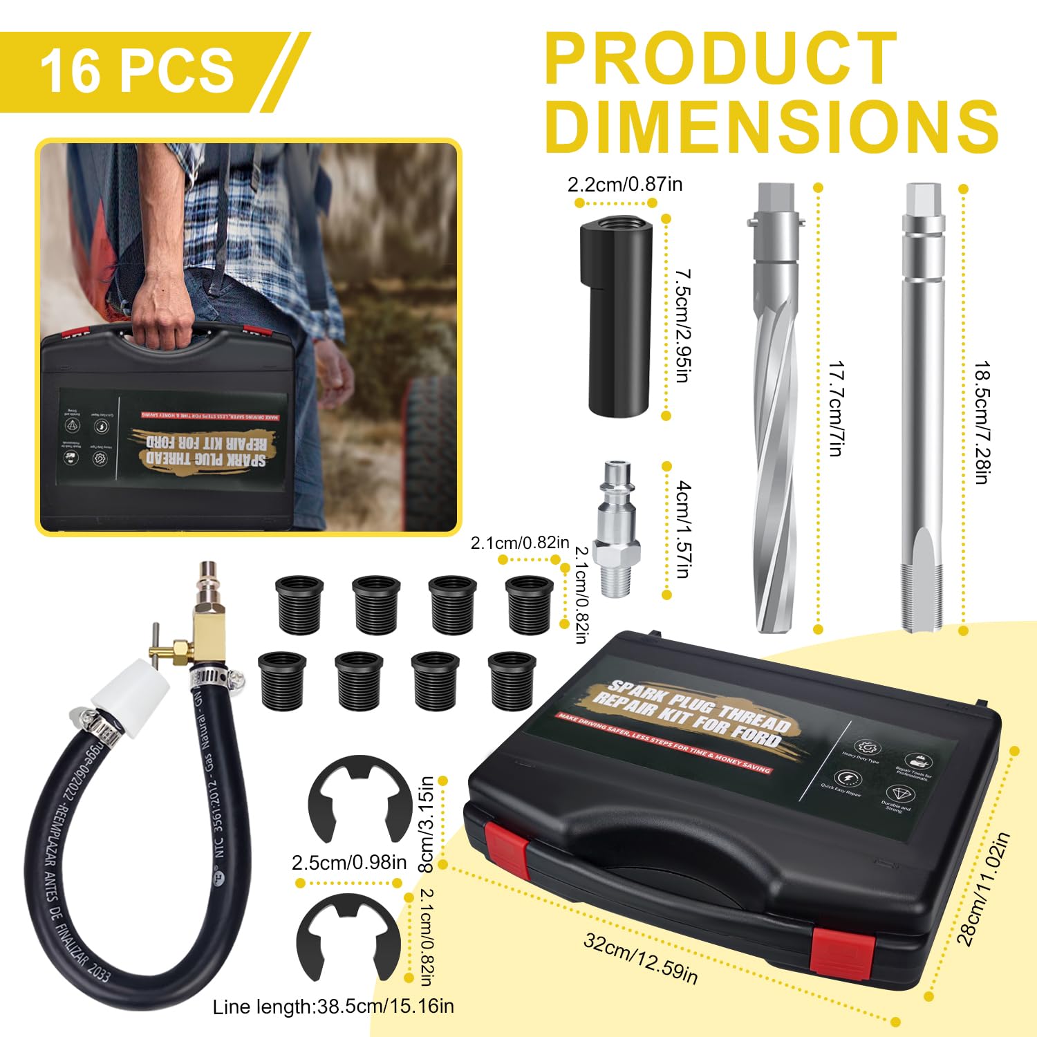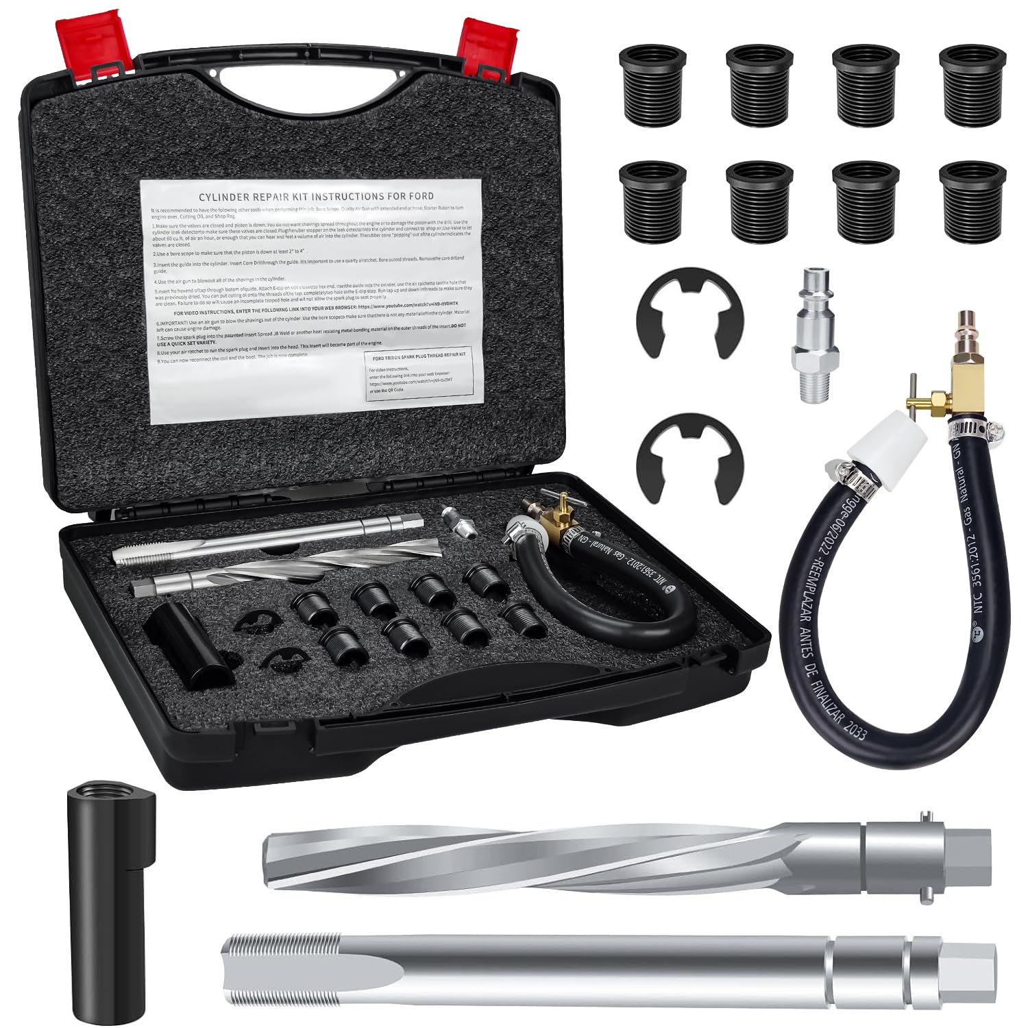1. Compatible con Ford Triton 1996-2003 El Kit de Reparación de Roscas de Bujías ayuda a reparar dos cabezas de cilindros modulares con válvulas. Nuestro Kit de Herramientas de Dos Válvulas 38900 viene con insertos M14-1.25 y es compatible con modelos Ford de 1996 a 2003. El kit de herramientas para bujías se utiliza en motores duales de válvula de 4.6 litros, 5.4 litros y 6.8 litros V-10, y los números de parte 389-100 se pueden reemplazar e insertar directamente para su uso. Las herramientas profesionales pueden ayudarte a reparar roscas y reemplazar enchufes correspondientes. 2. Kit Profesional de Reparación de Roscas de Bujías El Kit de Reparación de Roscas de Bujías resuelve el problema de daño en la cabeza del cilindro causado por bujías rotas, la herramienta profesional puede ayudarte a reparar las roscas y reemplazar los insertos correspondientes, evitando el alto costo de las reparaciones automotrices profesionales. Este kit de herramientas de dos válvulas 38900 es completo, diseño especializado, preciso y perfectamente adaptado. PS: Cabeza rotativa de grifo de tornillo, taladro de torsión, generalmente necesita ser recubierto con aceite antiherrumbre para mantenimiento, si no se utiliza durante mucho tiempo, se debe aplicar aceite antiherrumbre antes de almacenar para evitar la corrosión durante el almacenamiento a largo plazo. 3. Satisface tus Necesidades de Reparación Todos los componentes de nuestro kit de reparación de cilindros de bujías han sido sometidos a rigurosas pruebas para garantizar el más alto rendimiento y durabilidad. La hoja M14-1.25 del Kit de Herramientas de Dos Válvulas 38900 tiene una alta dureza y está tratada con oxidación negra en la superficie para evitar la corrosión y el óxido, haciéndola más duradera que los tornillos comunes. La broca, el grifo y el extractor de cables están hechos de acero de alta calidad y alto rendimiento, que ha sido sometido a un tratamiento de templado alto y tiene afilado y durabilidad máxima. 4. Paquete Incluido El kit de reparación de bujías incluye: Probador de Fugas de Cilindro 1, Guía de Alineación 1, Taladro de Torsión 1, Grifo de Tornillo 1, Piezas de Hierro de Enganche 2, Insertos M14-1.25 8, Boquilla de Repuesto 1. Hay un total de 15 piezas en la caja, por favor revisa el producto cuidadosamente después de recibir el kit de reparación de roscas. Ofrecemos dos instrucciones, una está fija en la caja de embalaje y no se perderá, la otra se puede sacar para revisar, muy flexible. Las instrucciones incluidas te ayudarán a arreglar el montaje de la cabeza de cilindro en poco tiempo, ayudándote a lograr tu objetivo de ahorrar tiempo y dinero! 5. Excelente Servicio Postventa Por favor, siéntete libre de contactarnos si hay algún problema, daño o inadecuación con nuestra herramienta de reparación de roscas. Puedes comprar con confianza, ofrecemos un servicio de garantía de dos años. Nota: Antes de comenzar la reparación, asegúrate de que las válvulas del motor estén cerradas con la ayuda de un probador de fuga de cilindros y quita las virutas de metal en el cilindro después de cada paso para verificar si todas ellas han sido eliminadas y asegurarte de que no habrá daños en el motor.