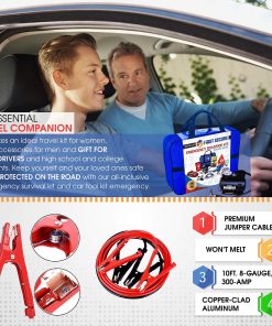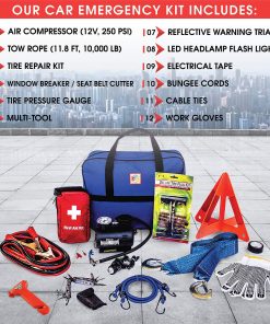 VIAJE CON LA TRANQUILIDAD QUE USTED Y SUS SERES QUERIDOS MERECEN Cuando se encuentra en una situación de emergencia en carretera, lo último que desea es un kit de cuidado de automóvil lleno de herramientas baratas y poco confiables que se derriten y se desmoronan. Ideal para cualquier automóvil: camión, deportivo, furgoneta, sedán, ATV, RV, motocicleta En First Secure, hemos seleccionado herramientas de coches fuertes y duraderas para nuestro Kit de Emergencia para Coche. Nuestros cables de arranque están hechos con aluminio revestido de cobre que no se derrite, y nuestra correa de remolque de nylon de alta resistencia de 11.8 pies es más fuerte y más larga que la mayoría, con una capacidad de remolque de 10,000 libras. A diferencia de las bombas de aire de plástico, nuestro compresor de aire portátil está hecho de materiales resistentes. Mientras que otros kits de emergencia para coches a menudo tienen rellenos que nadie necesita en un kit de emergencia en carretera para autos, nuestro kit de emergencia para vehículos tiene herramientas que son esenciales en una situación de emergencia, algunas de las cuales, como nuestro rompevidrios y kit de reparación de neumáticos, son únicas en nuestro kit de seguridad para autos. Nuestro Conjunto de 90 Piezas para Carretera incluye: -Cables de Arranque de Aluminio Revestido de Cobre (10 pies, calibre 8, 300 amperios) -Compresor de Aire (12V, 250 PSI) -Cuerda de Remolque (11.8 pies, 10,000 lb) -Kit de Reparación de Neumáticos -Rompevidrios -Manómetro para Neumáticos -Herramienta Multifunción -Triángulo de Advertencia Reflectante -Linterna Frontal LED -Cinta Aislante -Cuerdas Elásticas -Correas de Cable -Guantes de Trabajo -¡Y mucho más! El Conjunto de Primeros Auxilios de 48 Piezas de nuestro kit incluye: -Torniquete -Almohadillas de Gasa -Vendajes Adhesivos -Vendaje Triangular -Vendas PBT -Cinta Médica -Tijeras -Broches de Seguridad -Hisopos de Algodón En First Secure, nuestra principal prioridad es mantener seguros a sus seres queridos con nuestras herramientas de coche de emergencia duraderas y de alto rendimiento. Si no está satisfecho con su kit de cables de arranque para coche, le devolveremos su pago en su totalidad, sin hacer preguntas.