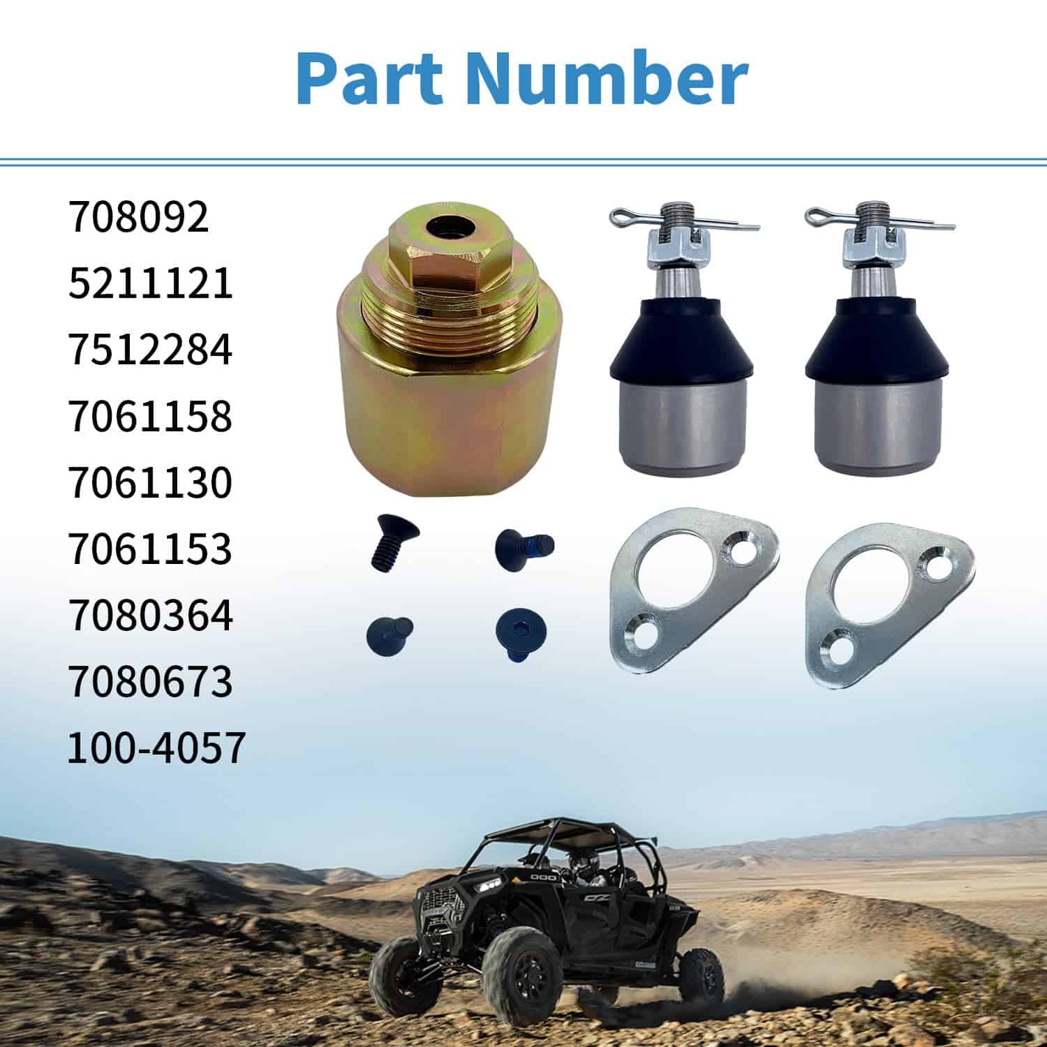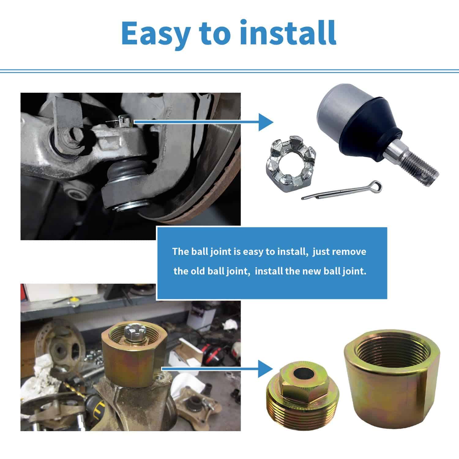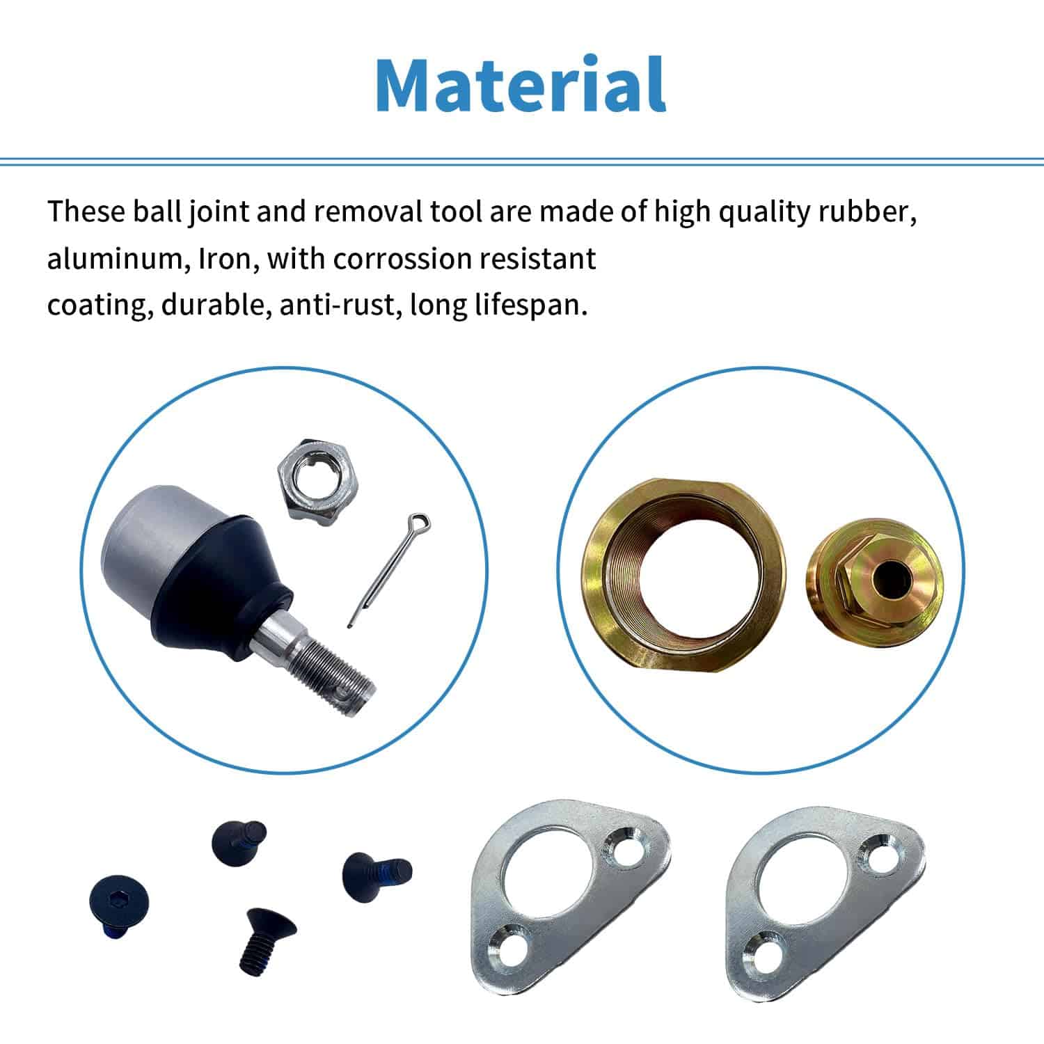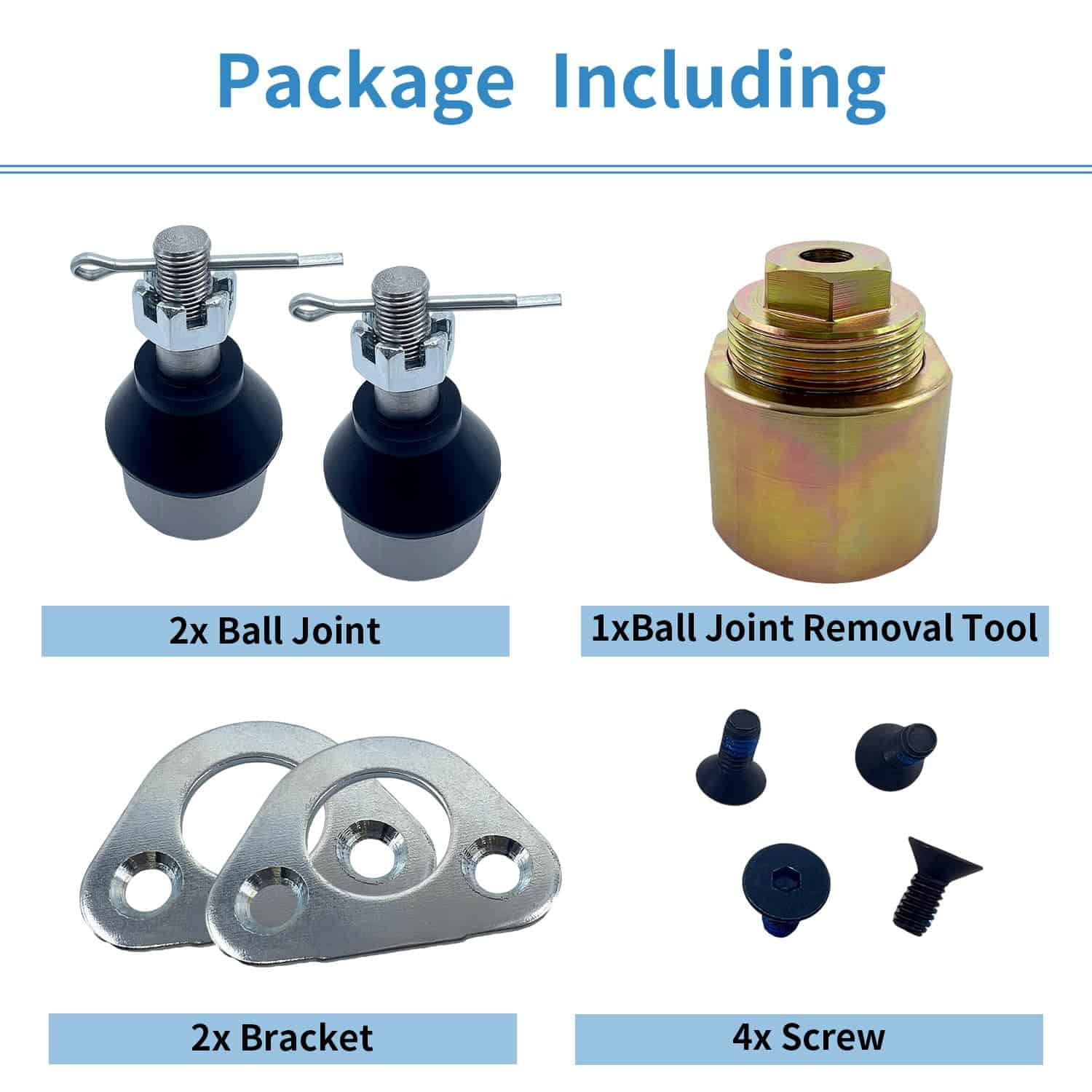 4. Paquete incluido: 4x Tornillo 2x Pasador Dividido 2x Soporte, 2x Junta de Bola, 2x Tuerca de Seguridad, 1x Juego de Herramientas de Extracción de Junta de Bola delantera.