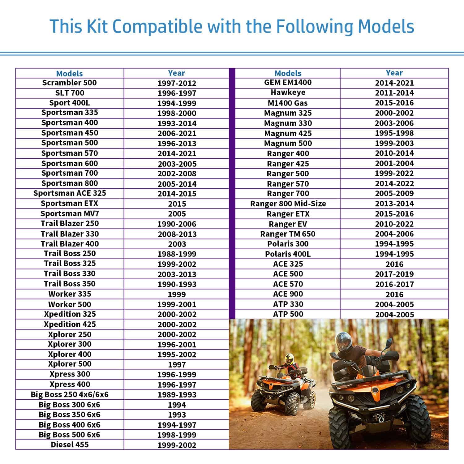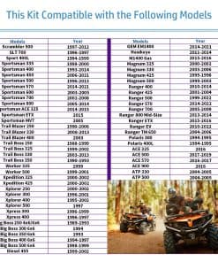 1. Compatible con Polaris 300 400L ACE 150 500 570 900 ATP 330 Big Boss 250 300 350 400 500 Diesel 455 Magnum 325 330 425 500 Ranger 400 500 570 700 800 EV Li-Ion Electric Scrambler 400 500 Sportsman 335 400 450 500 570 600 700 800 ACE ETX MV7 Trail Blazer 250 300 325 330 400 425 450 500 570 600 700 800 Worker 335 500 Xpedition 325 300 250 500 400.