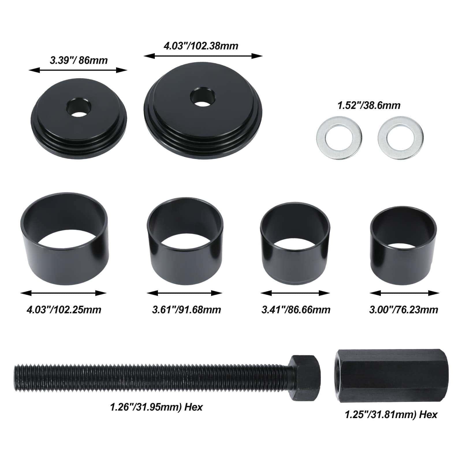 Especificación: Manga A-D : A – 4.03″(102.25mm) Diám. ext. x 2.55″(64.65mm) Longitud B – 3.61″(91.68mm) Diám. ext. x 2.55″(64.65mm) Longitud C – 3.41″(86.66mm) Diám. ext. x 2.55″(64.65mm) Longitud D – 3.00″(76.23mm) Diám. ext. x 2.55″(64.65mm) Longitud Arandela E : E – 1.52″(38.6mm) Diám. ext. & 0.91″(23mm) Diám. int. Casquillo F-Q : F – 2.16″(54.92mm) Diám. ext. x 0.55″(14.01mm) Espesor G – 2.32″(58.93mm) Diám. ext. x 0.55″(14.01mm) Espesor H – 2.48″(62.95mm) Diám. ext. x 0.55″(14.01mm) Espesor I – 2.62″(66.49mm) Diám. ext. x 0.55″(14.01mm) Espesor J – 2.75″(69.75mm) Diám. ext. x 0.55″(14.01mm) Espesor K – 2.81″(71.41mm) Diám. ext. x 0.55″(14.01mm) Espesor L – 2.89″(73.46mm) Diám. ext. x 0.55″(14.01mm) Espesor M – 2.95″(75.00mm) Diám. ext. x 0.55″(14.01mm) Espesor N – 3.05″(77.55mm) Diám. ext. x 0.55″(14.01mm) Espesor O – 3.21″(81.46mm) Diám. ext. x 0.55″(14.01mm) Espesor P – 3.28″(83.25mm) Diám. ext. x 0.55″(14.01mm) Espesor Q – 3.48″(88.34mm) Diám. ext. x 0.55″(14.01mm) Espesor Installer de Buje de Rueda R : R – 2.87″(72.93mm) Diám. ext. x 0.79″(20.02mm) Espesor Placas de Manga S-T : S – 4.03″(102.38mm) Diám. ext. x 0.71″(18.03mm) Espesor T – 3.39″(86mm) Diám. ext. x 0.71″(18.03mm) Espesor Tornillo de Fuerza Deslizante U : U – 1.26″(31.95mm) Hex x 8.27″(210mm) Longitud Tuerca de Fuerza Deslizante V : V – 1.25″(31.81mm) Hex x 2.36″(60mm) & 0.78″(19.75mm) Diám. int.