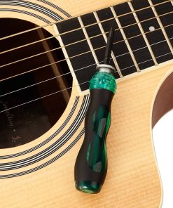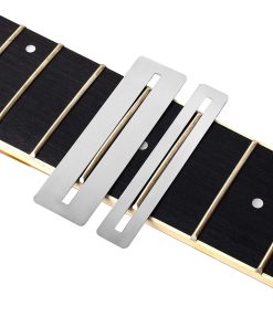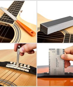 El KIT DE HERRAMIENTAS DE GUITARRA LUTHIER INCLUYE 1 barra de lijado y nivelación de trastes de 8 pulgadas, 1 lima de coronación de luthier, 1 medidor de acción de cuerdas, 9 calibradores de radio de cuerdas, 2 protectores de diapasón, 4 papeles de lija de repuesto, 1 destornillador de doble uso y 1 bolsa de almacenamiento portátil. La LIMA DE CORONACIÓN DE TRASTES y los PROTECTORES DE DIAPASÓN están hechos de acero inoxidable y son duraderos. La lima de coronación de trastes se utiliza para estrechar la coronación del traste después de nivelar, y el cómodo mango de goma ergonómico lo hace eficiente y ahorra tiempo al pulir o vestir el alambre del traste. Los protectores de diapasón se utilizan para proteger el diapasón de la guitarra, bajo u otro instrumento de cuerda de rayones o daños mientras se liman y pulen. Los 9 CALIBRADORES DE RADIO DE CUERDAS están hechos de acero inoxidable y son duraderos. Juego de 9 calibradores que incluyen radios de 7,25″, 9,5″, 10″, 12″, 14″, 15″, 16″, 17″ y 20″, aplicados para medir con precisión el radio del diapasón, el radio de la selleta y el radio de la tuerca desde la superficie superior o inferior del radio. Una herramienta de reparación de guitarra imprescindible para mantenimiento y ajuste. La BARRA DE LIJADO Y NIVELACIÓN DE TRASTES está hecha de aleación de aluminio, resistente, a prueba de óxido y de mano de obra fina. Hay cuatro tipos de papeles de lija autoadhesivos (400, 600, 1000, 1200) en los cuatro lados de la barra de nivel, aplicados para satisfacer sus diferentes necesidades de pulido. También viene con un juego de papeles de lija para repuesto y uso a largo plazo. El MEDIDOR DE ACCIÓN DE CUERDAS está hecho de acero inoxidable y tiene un tamaño de bolsillo. Se utiliza para medir la altura de las cuerdas, la altura de la selleta del puente, la altura del polo de la pastilla, la altura de la tuerca, la profundidad de la ranura de la selleta, la profundidad de la ranura del traste, etc. También está impreso con una tabla de conversión de la acción de las cuerdas en el traste 12.