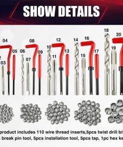 Especificaciones y empaque: 110 piezas de insertos de alambre: 25xM5, 25xM6, 25xM8, 25xM10, 10xM12. 5 brocas helicoidales, 5 herramientas de pasador de rotura, 5 herramientas de instalación, 5 grifos, 1 llave hexagonal.