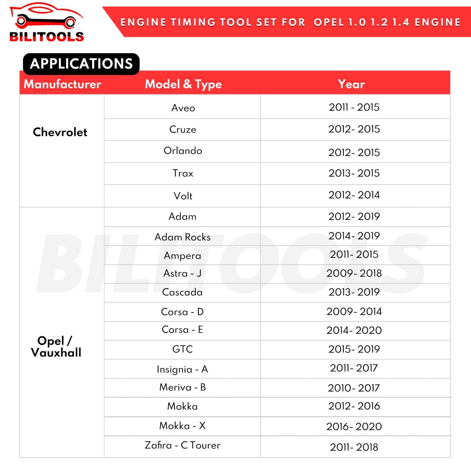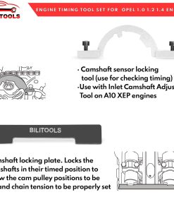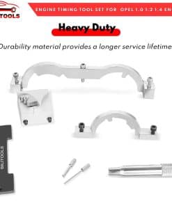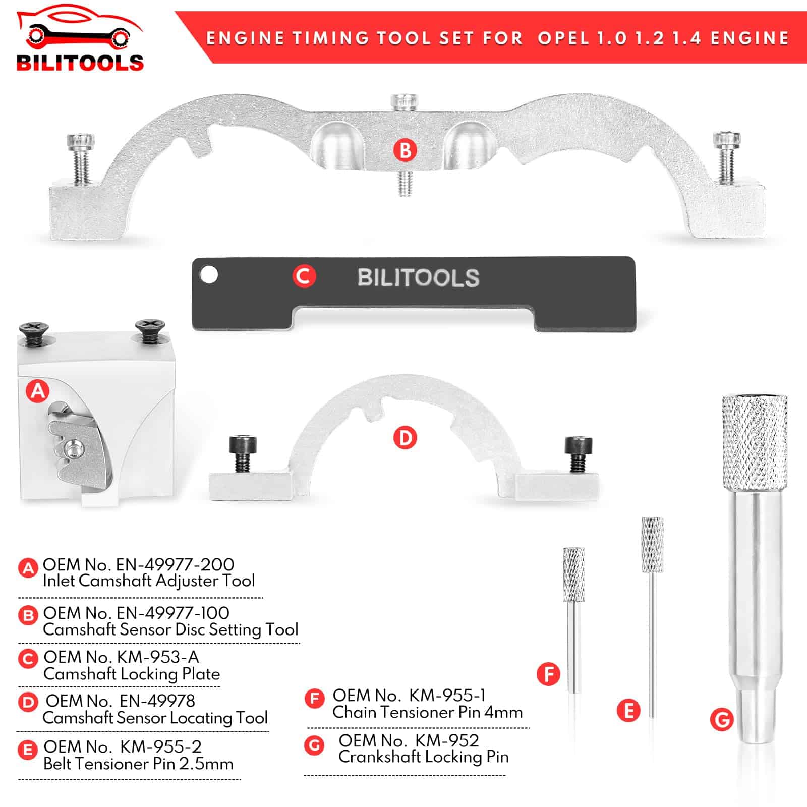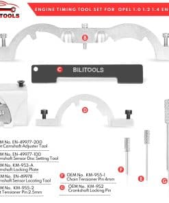 Kit de herramientas de sincronización de motor turbo 1.0 1.2 1.4 L BILITOOLS compatible con Chevrolet Chevy Cruze Opel Vauxhall conjunto de herramientas de bloqueo de alineación del árbol de levas. Amplia compatibilidad con vehículos Compatible con modelos Chevrolet y Opel/Vauxhall: Compatible con Chevrolet: Aveo (2011-2015), Cruze (2012-2015), Orlando (2012-2015), Trax (2013-2015), Volt (2012-2014). Compatible con Vauxhall: Adam, Astra J, Cascada, Corsa D/E, Insignia A, Mokka, Meriva B, Zafira-C Tourer (2009-2020). Precisa compatibilidad con motores Diseñado para motores 1.0L, 1.2L y 1.4L, incluidos códigos populares como: 1.0L: A10XEP (ecoFLEX) 1.2L: A12XEL, A12XER, LDC/B12XEL, LWD/B12XEL, L2Q/A12XEL 1.4L: A14XEL, A14XER, LDD/A14XER, LUJ/A14NET, LUH/A14NEL, LDD/B14XER y LUJ/B14NEH. Completo conjunto equivalente al OEM Incluye herramientas esenciales como Placa de bloqueo del árbol de levas, Herramienta de ajuste del disco del sensor del árbol de levas, Pasador tensor de cadena (4mm), Pasador tensor de correa (2.5mm), Pasador de bloqueo del cigüeñal y Herramienta ajuste del árbol de levas de admisión. NUMERO DE OEM EN-49977-100 KM-953-A EN-49977-200 EN-49978 KM-955-1 KM-955-2 KM-952. Estuche portátil duradero Empaquetado en un estuche moldeado por soplado resistente para una organización, almacenamiento y transporte fáciles. Mantiene todos los componentes seguros y accesibles para su uso en el taller o en movimiento.