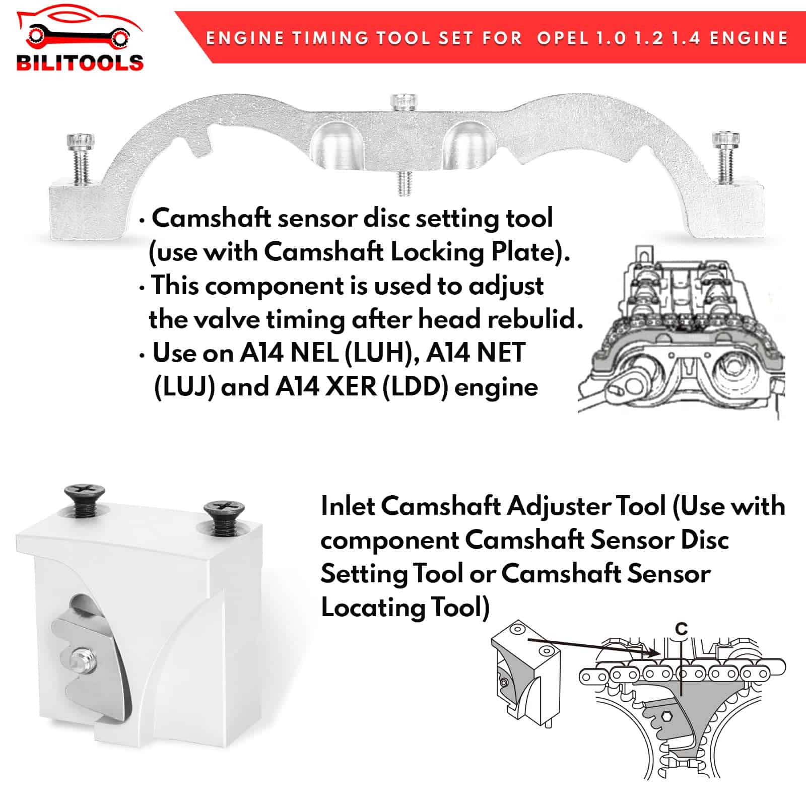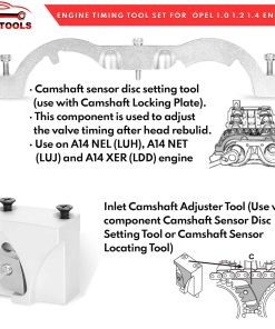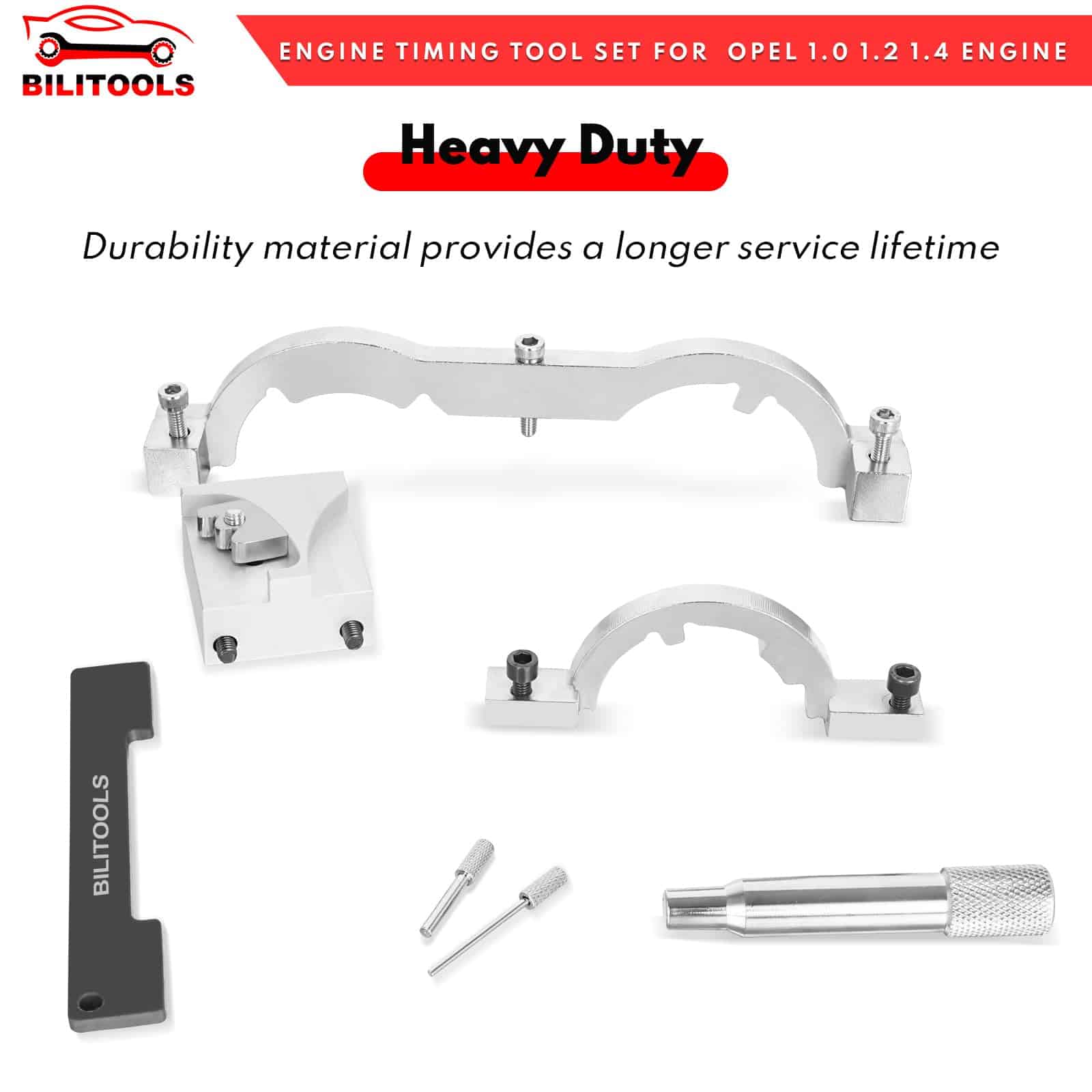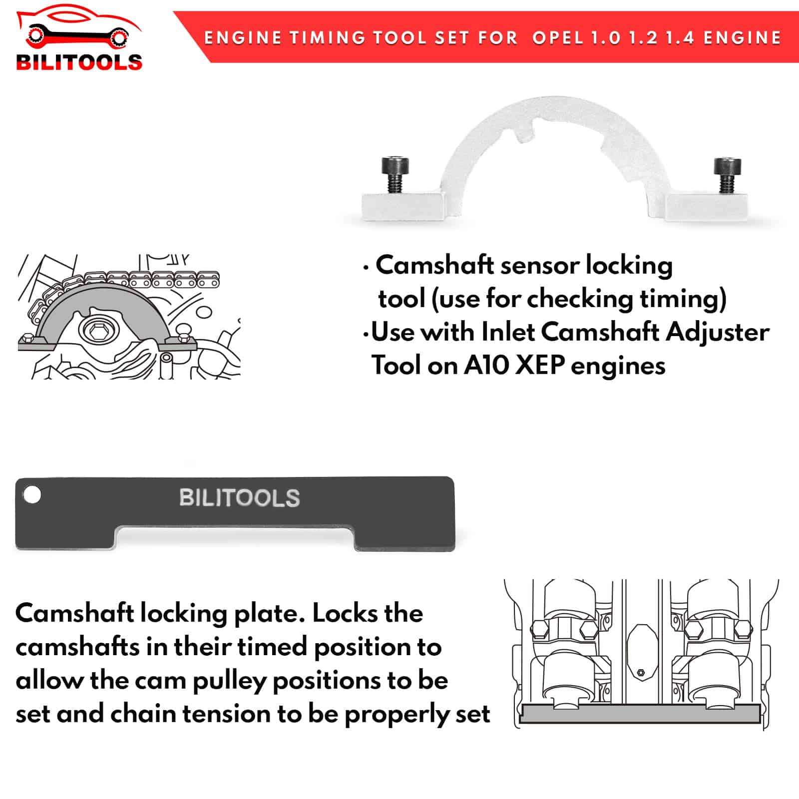Kit de herramientas de sincronización de motor turbo 1.0 1.2 1.4 L BILITOOLS compatible con Chevrolet Chevy Cruze Opel Vauxhall conjunto de herramientas de bloqueo de alineación del árbol de levas. Amplia compatibilidad con vehículos Compatible con modelos Chevrolet y Opel/Vauxhall: Compatible con Chevrolet: Aveo (2011-2015), Cruze (2012-2015), Orlando (2012-2015), Trax (2013-2015), Volt (2012-2014). Compatible con Vauxhall: Adam, Astra J, Cascada, Corsa D/E, Insignia A, Mokka, Meriva B, Zafira-C Tourer (2009-2020). Precisa compatibilidad con motores Diseñado para motores 1.0L, 1.2L y 1.4L, incluidos códigos populares como: 1.0L: A10XEP (ecoFLEX) 1.2L: A12XEL, A12XER, LDC/B12XEL, LWD/B12XEL, L2Q/A12XEL 1.4L: A14XEL, A14XER, LDD/A14XER, LUJ/A14NET, LUH/A14NEL, LDD/B14XER y LUJ/B14NEH. Completo conjunto equivalente al OEM Incluye herramientas esenciales como Placa de bloqueo del árbol de levas, Herramienta de ajuste del disco del sensor del árbol de levas, Pasador tensor de cadena (4mm), Pasador tensor de correa (2.5mm), Pasador de bloqueo del cigüeñal y Herramienta ajuste del árbol de levas de admisión. NUMERO DE OEM EN-49977-100 KM-953-A EN-49977-200 EN-49978 KM-955-1 KM-955-2 KM-952. Estuche portátil duradero Empaquetado en un estuche moldeado por soplado resistente para una organización, almacenamiento y transporte fáciles. Mantiene todos los componentes seguros y accesibles para su uso en el taller o en movimiento.