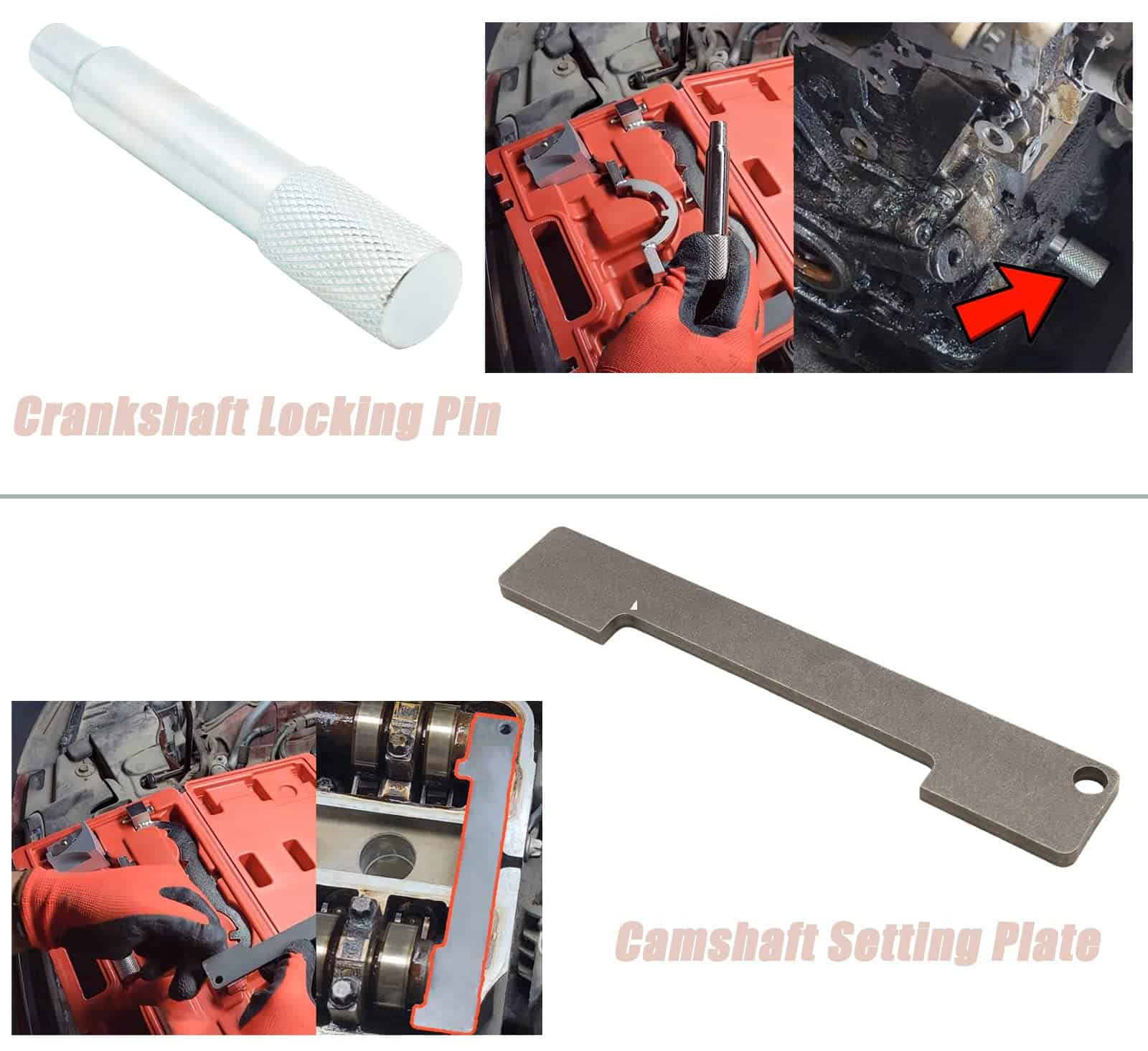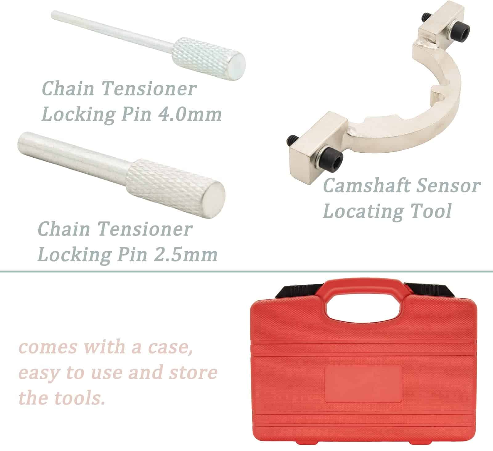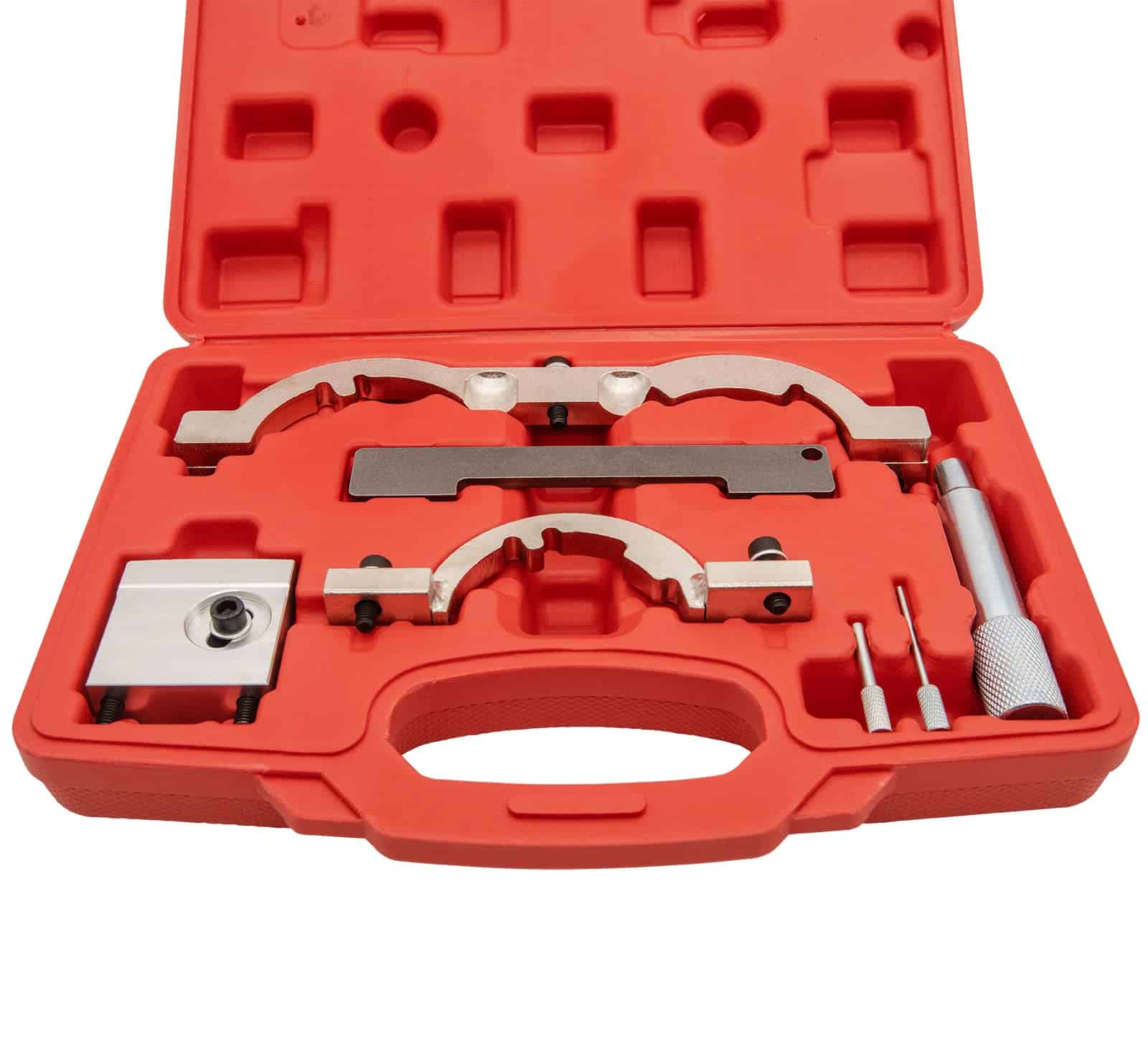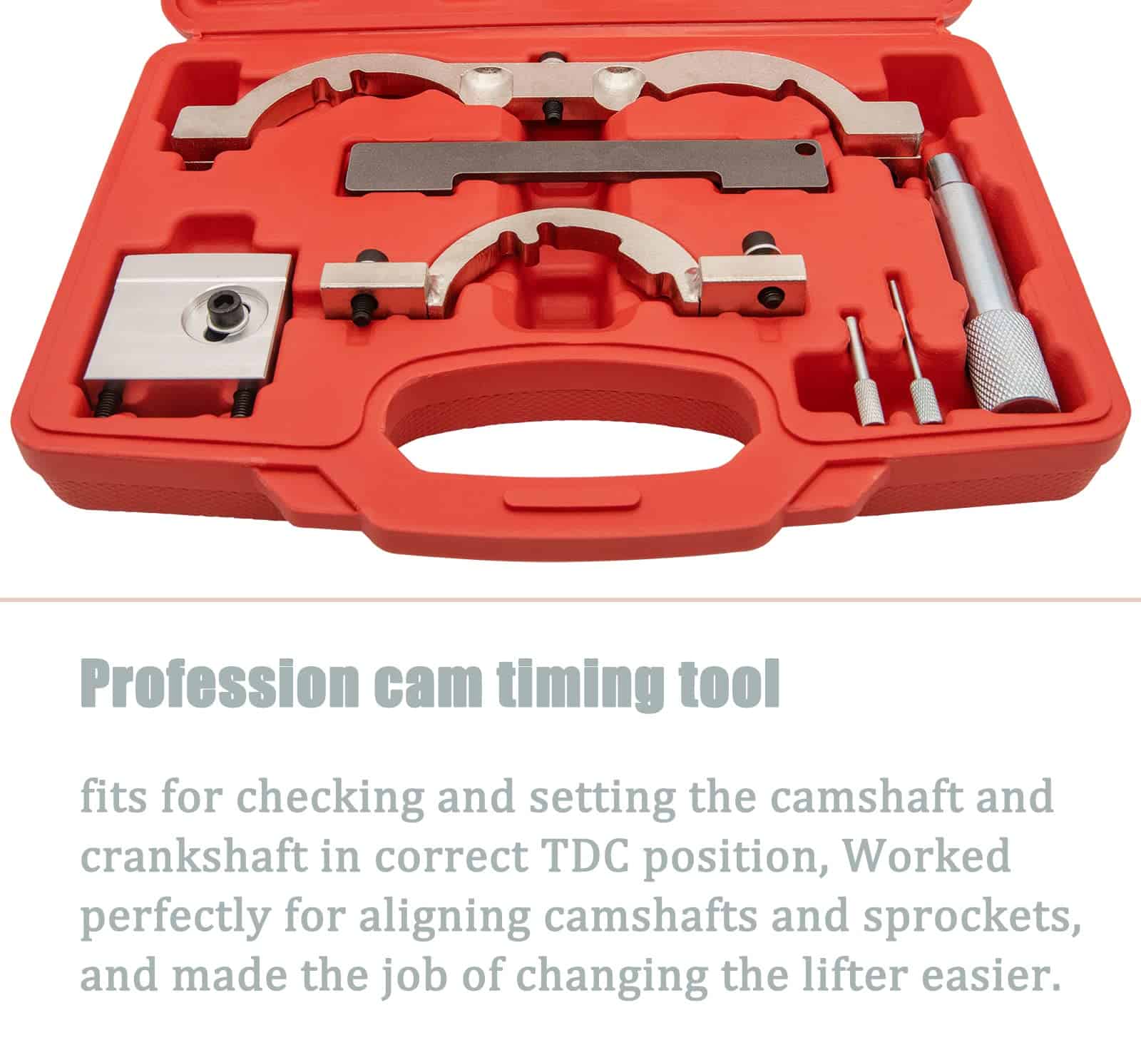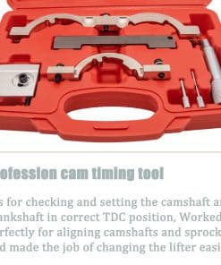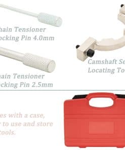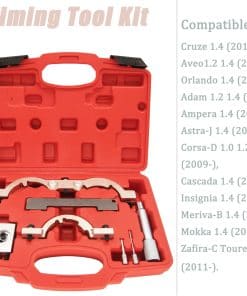Característica: El kit de herramientas de sincronización está construido con aluminio y acero de alta calidad para una calidad y durabilidad superiores. El kit de herramientas de sincronización viene con un estuche, fácil de usar y almacenar las herramientas. Función: La herramienta de sincronización de leva profesional se ajusta para revisar y establecer el árbol de levas y cigüeñal en la posición correcta de PMS, Funcionó perfectamente para alinear los árboles de levas y piñones, y facilitó el trabajo de cambiar el balancín. Nota: Asegúrese de que el tensor de la cadena esté completamente retraído y mantenido en la posición retraída usando un pasador adecuado. Retire la polea del cigüeñal utilizando una herramienta de retención de polea adecuada. Compatible con la aplicación: Cruze 1.4 (2011-), Aveo1.2 1.4 (2011-), Orlando 1.4 (2012-), Adam 1.2 1.4 (2012-), Ampera 1.4 (2011-), Astra-J 1.4 (2009), Corsa-D 1.0 1.2 1.4 (2009-), Cascada 1.4 (2013-), Insignia 1.4 (2011-), Meriva-B 1.4 (2010-), Mokka 1.4 (2012-), Zafira-C Tourer 1.4 (2011-). Códigos de motor: LDD, LWD, L2Z, LUU/A14XFL, LDD/A14XER, LDD/A14XEL, LUJ/114NET, LUJ/A14NEL, A10XEP, A12XEL, A12XER, A14XEL, A14XER, A14NEL, LUJ/A14NET, LDD/A14XER, LUJ/A14NET, LUH/A14NEL, LUJ/A14NET, LUJ/A14NEL, L2Q/A12XEL, LDC/A12XER, LWD/A12XEL, LDD/A14XEL, LDD/A14XER. El Kit de Herramientas de Sincronización Incluye: 1. Pasador de Bloqueo del Cigüeñal 2. Placa de Ajuste del Árbol de Levas 3. Herramienta de Ajuste del Sensor (1.0L) 4. Herramienta de Ajuste del Sensor (1.2 y 1.4L) 5. Herramienta de Sujeción del Piñón del Árbol de Levas 6. Pasador de Bloqueo del Tensor de la Cadena 7. Pasador de Bloqueo del Tensor de la Correa
