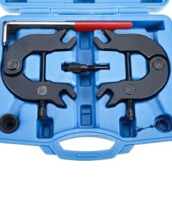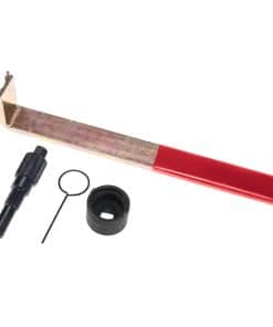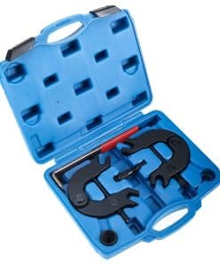 Kit de herramientas de sincronización del árbol de levas del motor diseñado para ser compatible con motores 3.0L V6 AVK instalados en plataformas Audi A4 y A6 entre los años 2000 y 2004. Este kit incluye dos soportes de alineación C bloqueables, uno derecho y otro izquierdo, que se interfazan con los árboles de levas para asegurar y mantener el Punto Muerto Superior (PMS), garantizando una sincronización precisa del motor. Además, cuenta con una llave de dado de 3/8″ para ajustar el tiempo de válvula variable en el árbol de levas de escape a la posición base. Este kit también es compatible con modelos como el VW Polo Diésel, el Audi 100 desde 1991 y el AUDI A6 con motor Z15L TDI. Incluye un perno largo para la configuración del cigüeñal en PMS, un perno de bloqueo del tensor y una llave de tensión en forma de L con mango ergonómico para facilitar su uso.