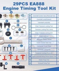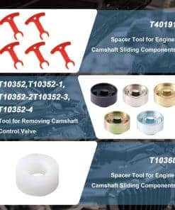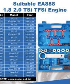 Kit de herramientas de sincronización del motor EA888 1.8L 2.0L TSI/TFSI – Herramienta de bloqueo de árbol de levas y cigüeñal con piezas deslizantes y separador, Compatible con modelos 2.0T T40191, T10352, T10368, T40196, T10354, T10060A, T40011, T40098. Este kit viene con una herramienta de sincronización y una herramienta de espaciador de árbol de levas, perfectamente adaptado para motores 2006-2018 EA888 1.8 y 2.0 TSi/TFSi. Incluye 2 grandes espaciadores T40191/2 y 3 espaciadores más pequeños T40191/1. Diseñado para trabajar con numerosos códigos de motores como BYT, BZB, CABA, CABB, CABD, CADA, CAEA, CAEB, CAWA, CAWB, CBFA, CCTA, CCZA, CCZB, CCZC, CDAA, CDAB, CDHA, CDHB, CDNB, CDNC, CDND, CESA, CETA, CFKA, CGYA, CJEB, CJBA, CJSB, y más. Con números de parte equivalentes a OEM como T10352, T10368, T40196, T10354, T10060A, T40011, T40098, T40267, T40271, y T40191, asegurando compatibilidad y rendimiento confiables. Ideal como reemplazo para vehículos Volkswagen 2006-2018 con motores EA888 1.8 y 2.0 TSi/TFSi. También es compatible con varios modelos como A3, A4, A5, A6, Q5, TT/TT Quattro 2.0T. Ofrecemos una garantía de 12 meses para tranquilidad. Si hay algún problema de calidad con la herramienta de sincronización EA888 1.8 y 2.0, ofreceremos un reembolso o un reemplazo.